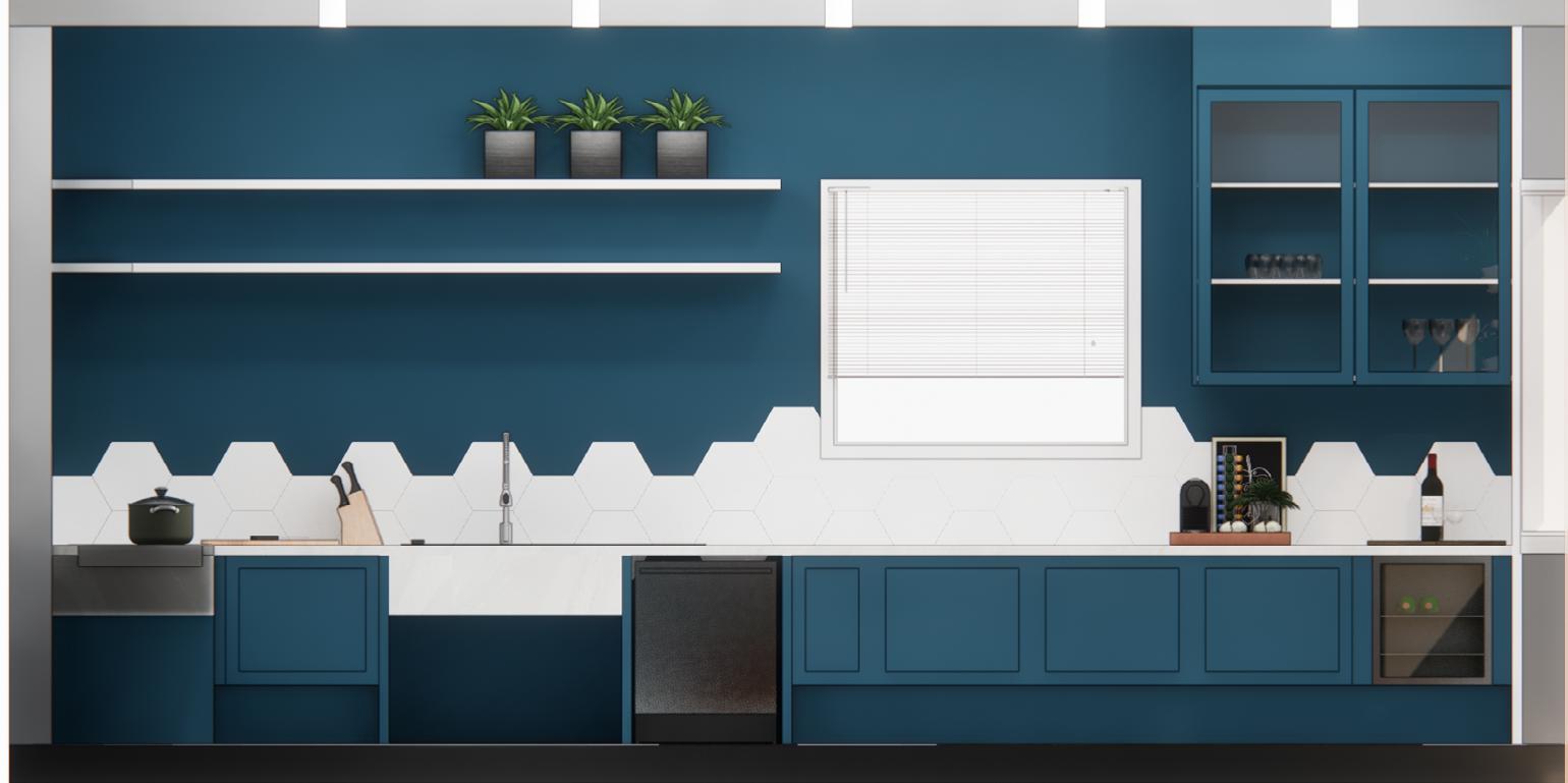 Blue Color: To capture the essence of the most beautiful night they ever experienced during a camping trip, I suggest using a deep blue hue for the kitchen’s walls and cabinets, evoking the tranquility and wonder of that memorable evening.