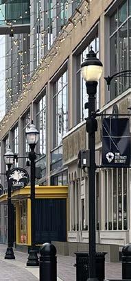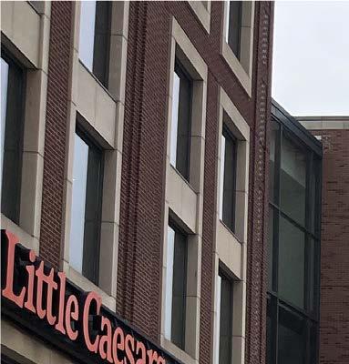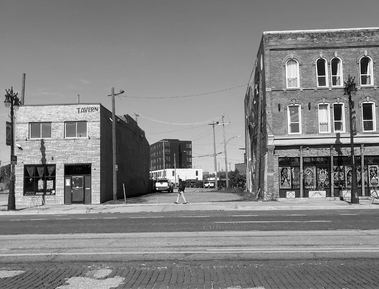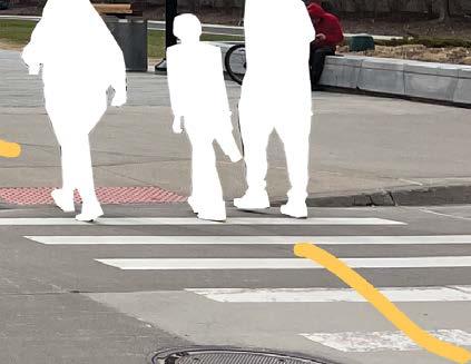 negative spatial traits. Observing vehicle speeds in person, for example, provides insight into where traffic calming measures could be implemented in the Corktown site. Monotonous and uninspired crosswalks are highlighted in the photographs, suggesting a need for more engaging and safer pedestrian environments. Most notably, the lack of people throughout the district is difficult to ignore. In one image, taken just two hours before a Detroit Pistons home game, only a few pedestrians are seen near Little Caesars Arena, with little to no fan activity in nearby bars and restaurants. The intention is not to replicate District Detroit. Instead, this case study serves to outline how public life and spatial engagement can be scaled more appropriately. The investigation emphasizes the importance of user experience, placing district vibrancy and connectivity at the forefront of future design considerations. It is also important to acknowledge the distinct differences in