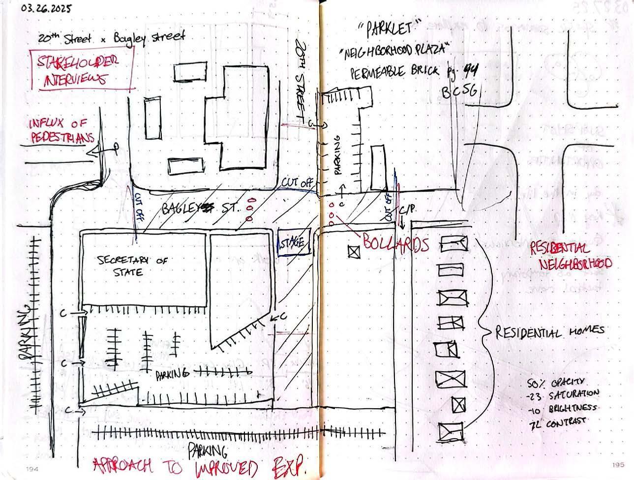 The Streets for People plan, developed by the City of Detroit’s Department of Public Works, provides a foundation for this thesis investigation. By focusing on improved mobility and safety throughout the city, particularly for residents most at risk, the plan supports a more inclusive and thoughtful approach to urban street design. Its guidance on implementation and street improvement strategies contributes to a clearer understanding of how streets can function as spaces for interaction and movement rather than being limited to vehicular use. The plan, shaped through input from a wide range of community members, emphasizes the importance of local perspectives in shaping public space. The statistics reflect resident input, guiding design through lived experience. These elements influence the development of values within the investigation, encouraging a street network that supports pedestrian activity, balances different modes of travel, and promotes everyday use by a variety of users.