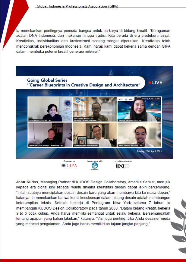 April 2021's GGS event aims to inspire Indonesian students and graduates abroad to reimagine their career trajectories through a global lens In this event, we invited Indonesian professionals working in KUDOS Design Collaboratory, Make Architects and Dialog in the US and Hong Kong.