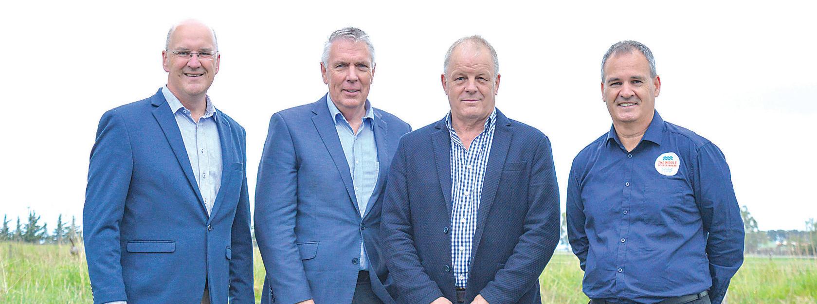 Member forGippsland South, DannyO’Brien withleader of TheNationals, Peter Walsh, Committee for Wellington chairDavid Anderson and Wellington Shire MayorIan Bye at the site for anew Sale College campus. Photo: Zoe Askew