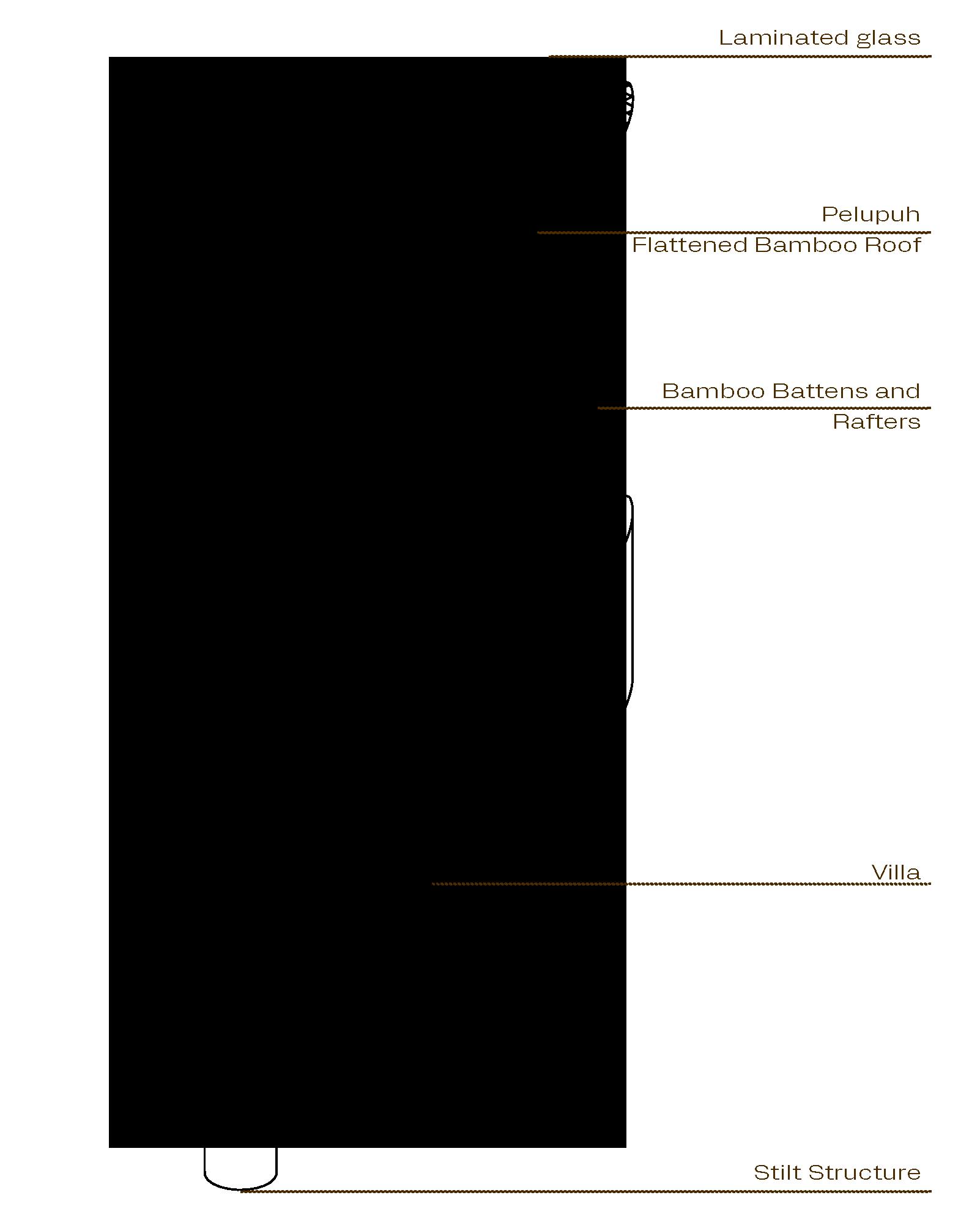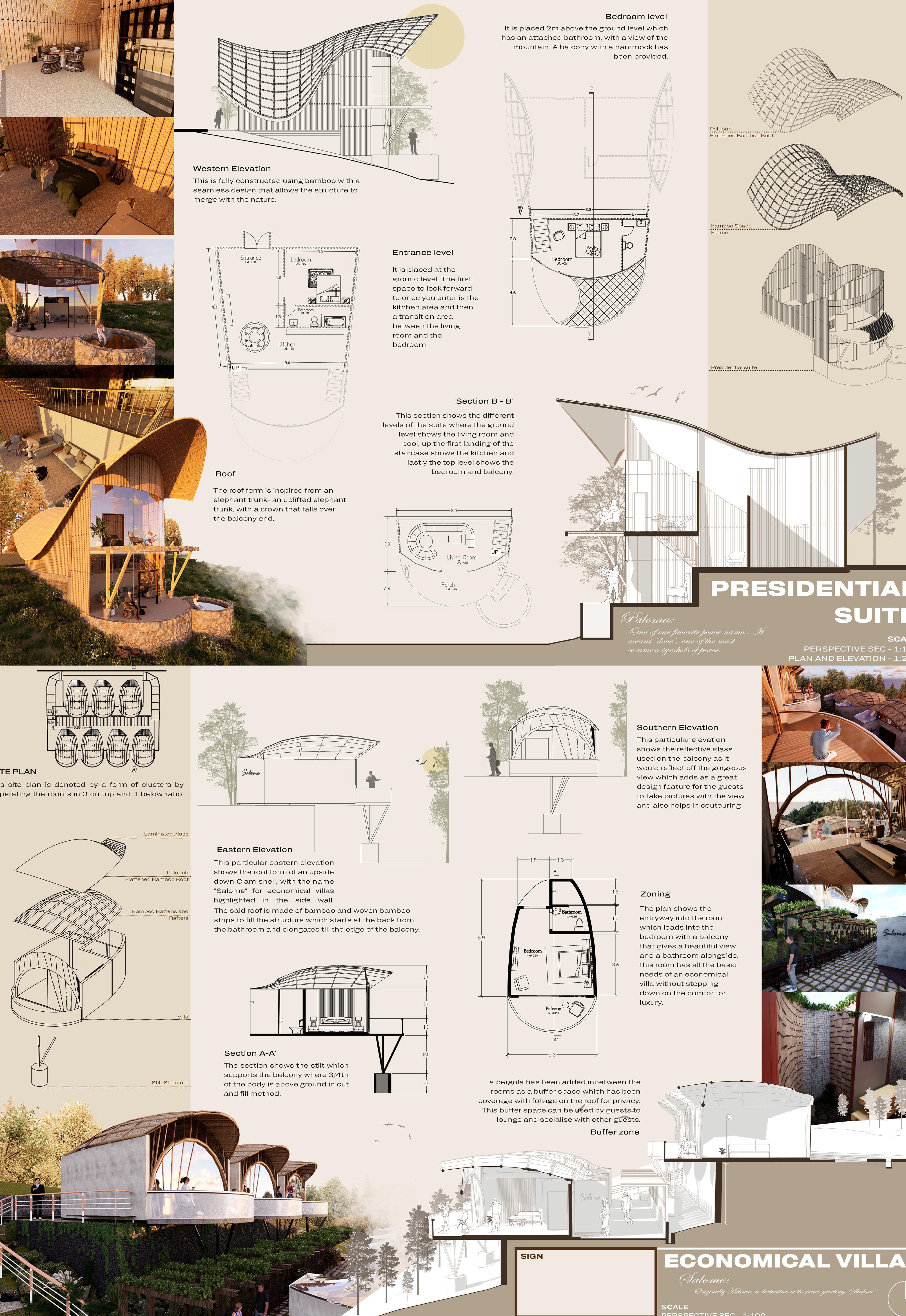 It shows the open restaurant, open kitchen with the exception of semi closed by walls in the pantry and bars. The whole elevation is of bamboo, the roofing is of a