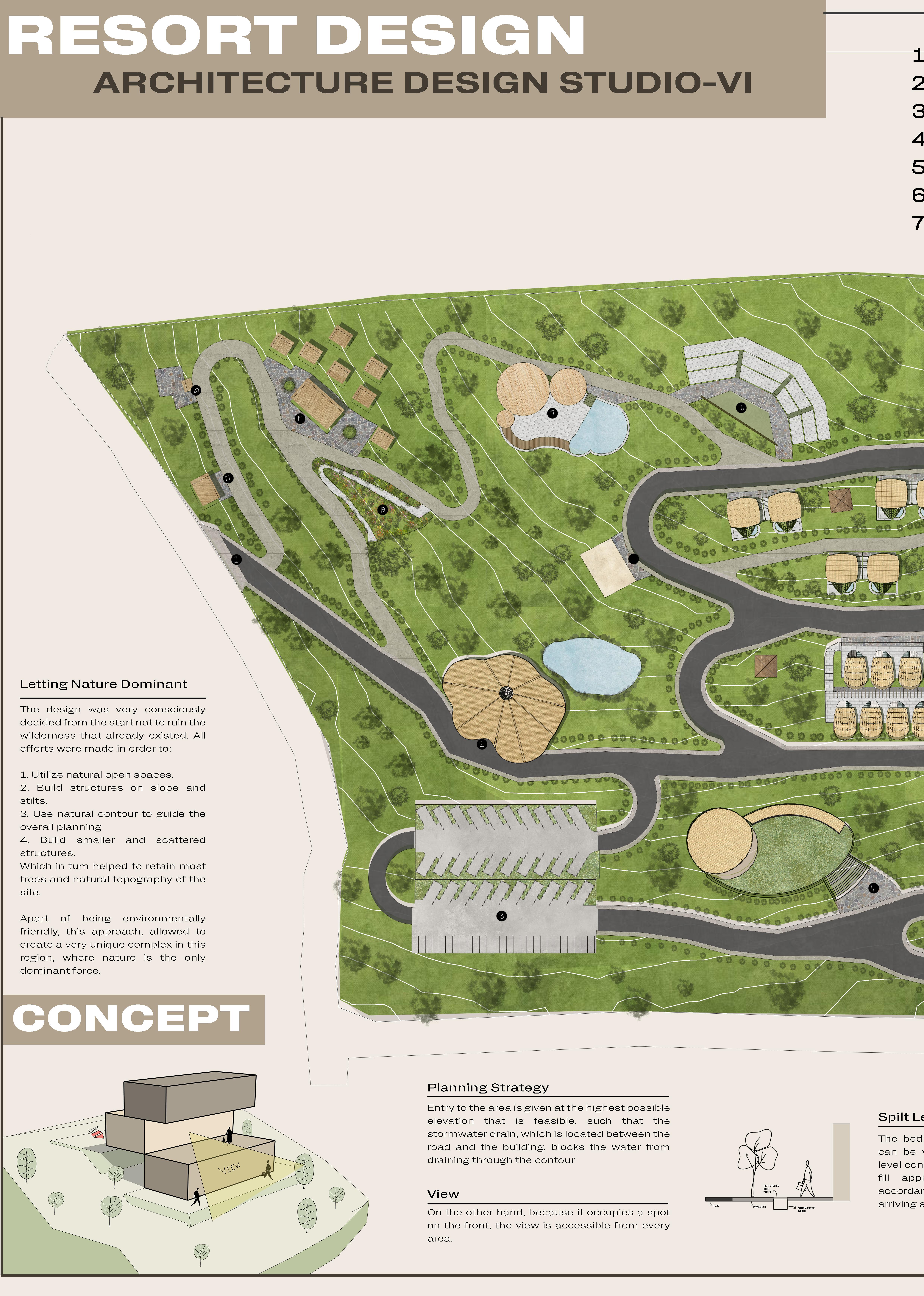 this site plan is denoted by a form of clusters by seperating the rooms in 3 on top and 4 below ratio,