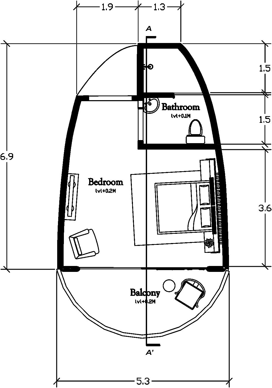 The plan shows the entryway into the room which leads into the bedroom with a balcony that gives a beautiful view and a bathroom alongside, this room has all the basic needs of an economical villa without stepping down on the comfort or luxury.