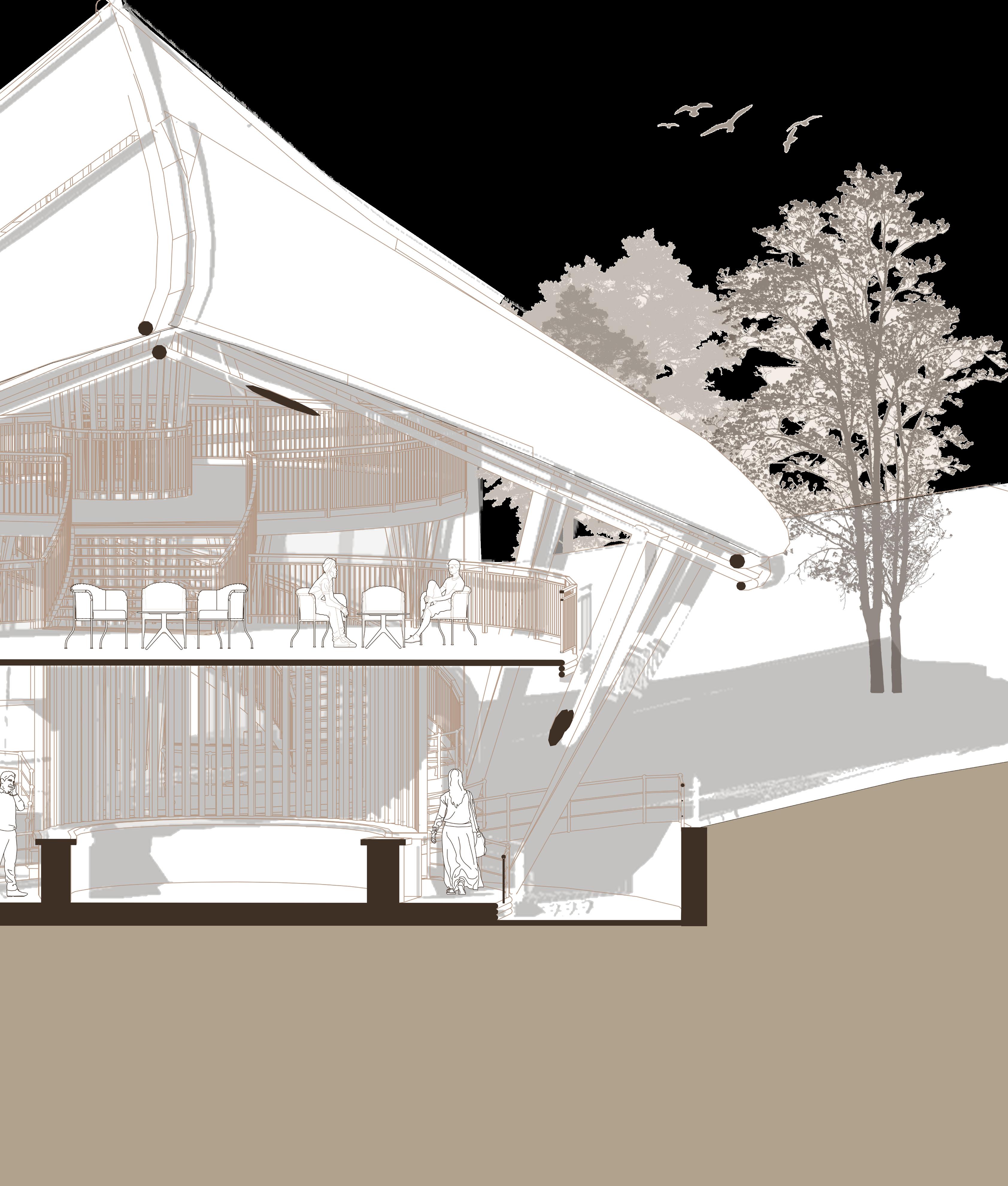 The levels of the restaurant has been split into two different circles where the lower level has the live kitchen restaurant with a buffet feature too and a secluded bar with a beautiful view of the pond.