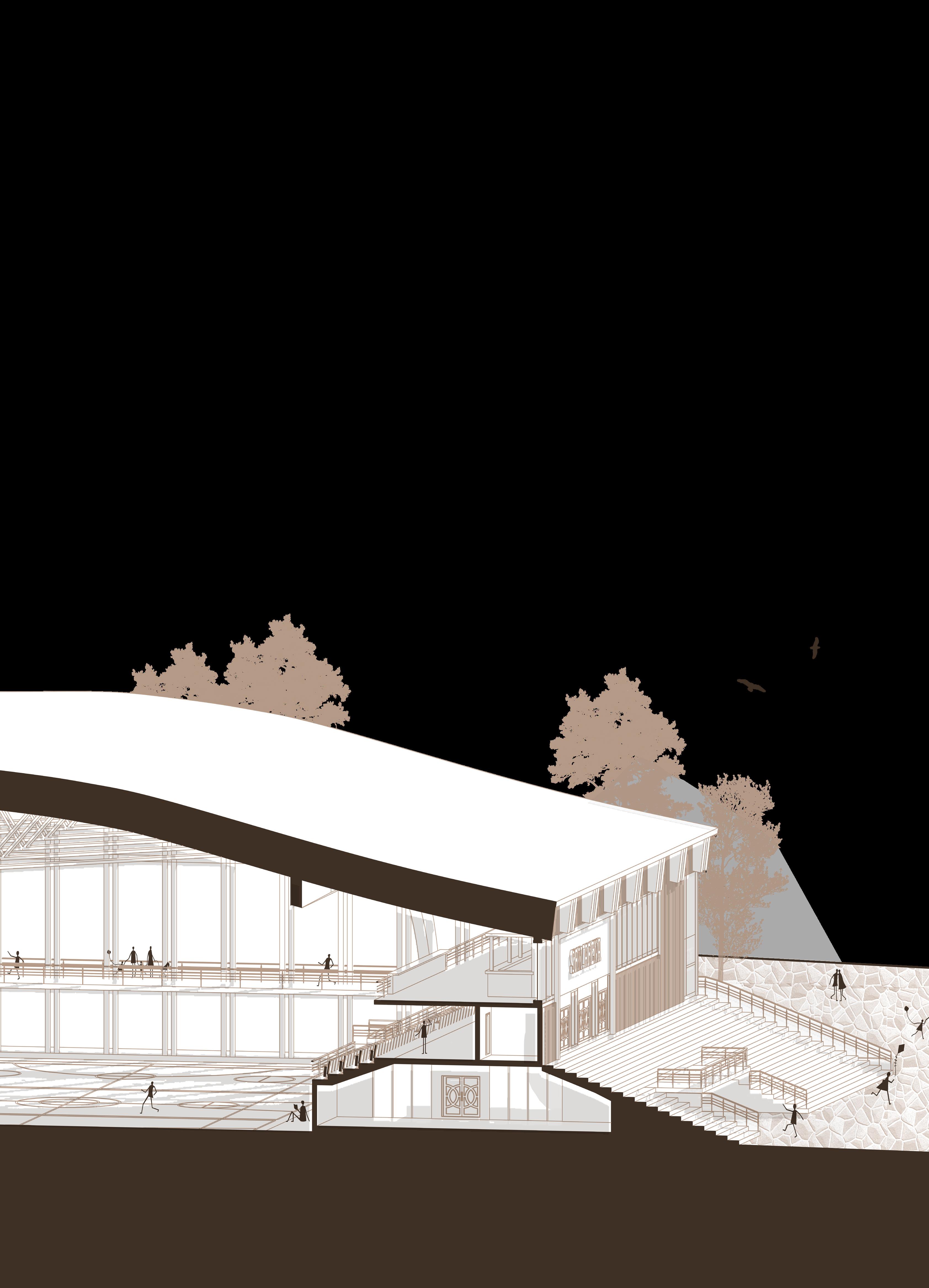 A proscenium arch delineates the space between the main court and practice gym. To allow for extended seating, the structural frame was required to span across the entire arena while maintaining a view corridor for spectators.