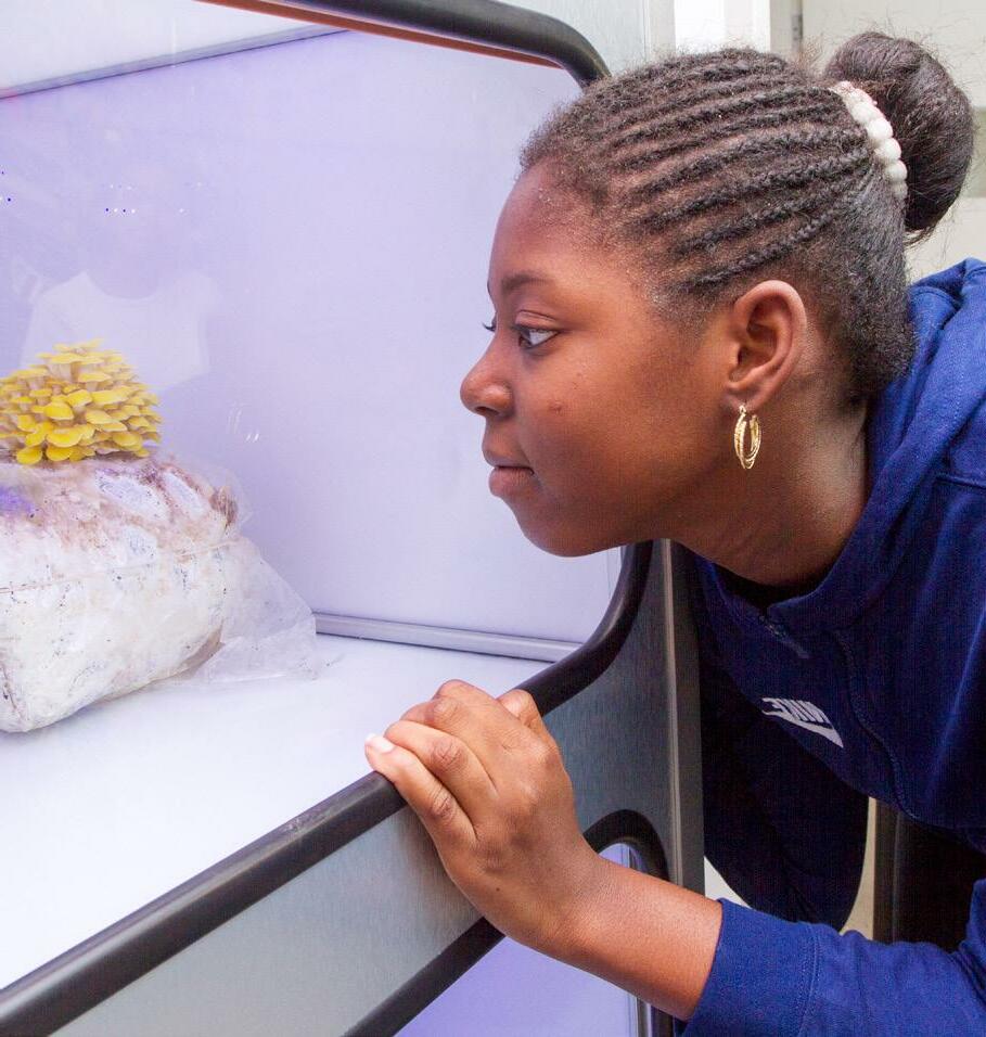 Each year, Girls Club members plant seeds and watch their work come to fruition. In Fall, participants roll up their sleeves and plant antioxidant-rich greens that thrive in cool weather. In Spring, we plant new seeds. In Summer, members harvest cucumbers, collard greens, tomatoes, and much more. Our mushroom cabinet allows us to grow, harvest and share immune-boosting mushrooms year-round. Our in-house partner Cafeteria Culture also works with us to lead classes in Environmental Education