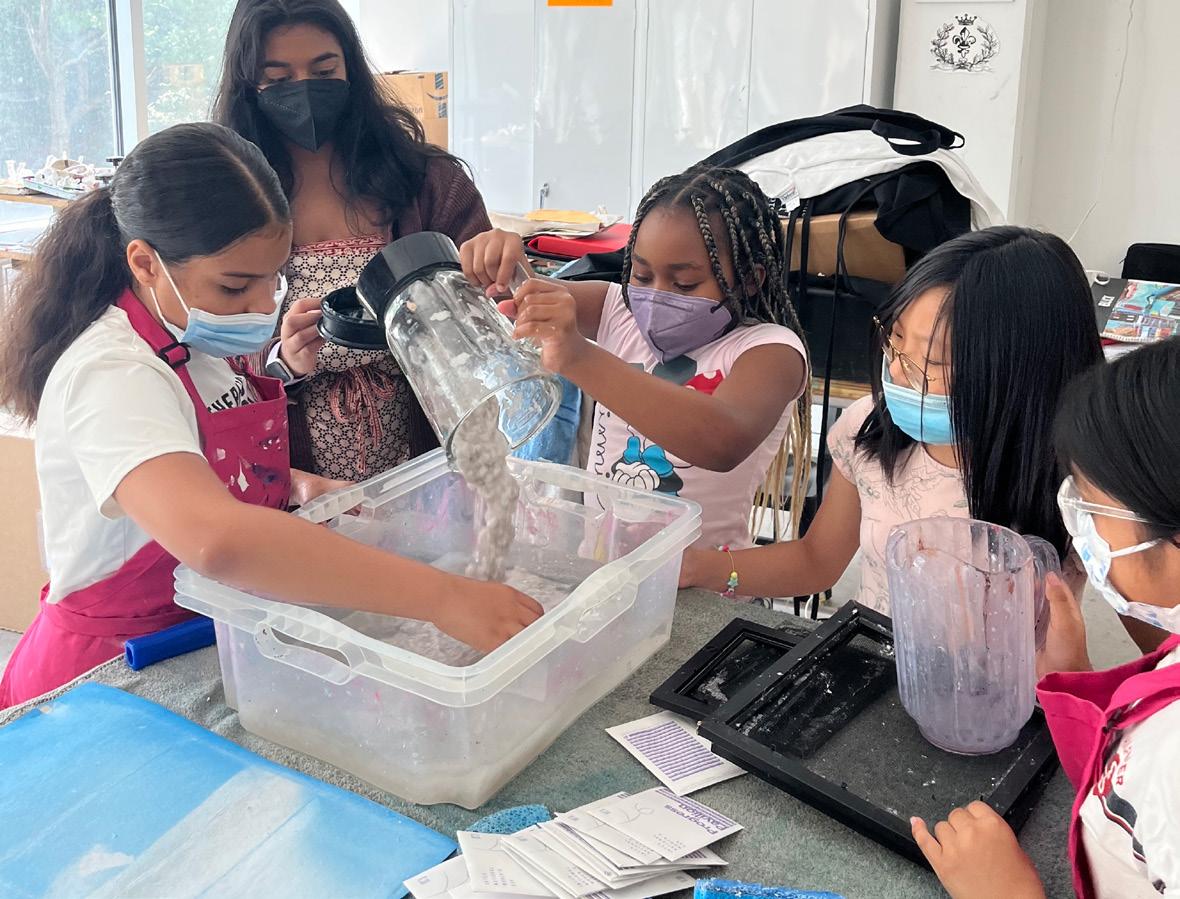 Alphabet City Art School programming includes an Artist-in-Residency program, daily art classes, exhibitions, artist talks, and field trips to museums and cultural institutions. Thanks to the generous support of MetLife Foundation, among others, Alphabet City Art School provides creative offerings which encourage and guide members to collaborate, engage in the design process, and think outside the box. Our visual arts programming is ideated through a lens of joy, curiosity, and playfulness and rooted in radical imagination. Members discover their passions as they explore a wide range of mediums, working with clay, acrylic paint, watercolors, and charcoal pencils. Activities include airbrush art, mural painting, ceramics, mosaic arts, working with Risograph techniques, screenprinting, and other forms of printmaking. In addition, members learn textile art methods, including: appliqué, natural dyeing, and quilting. Beyond visual art, our Crafting classes focus on community canvas quilting, handmade jewelry and beadwork, and paper-making.