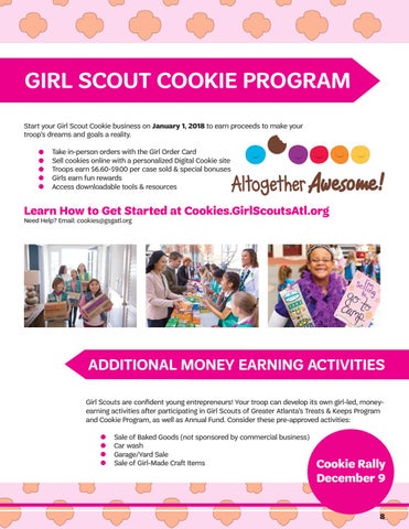 GIRL SCOUT COOKIE PROGRAM Start your Girl Scout Cookie business on January 1, 2018 to earn proceeds to make your troop’s dreams and goals a reality. • • • • •