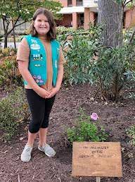 Cora Lanz of Troop 762 recently earned her Bronze Award by creating a COVID-19 Memorial at Chesapeake Regional Medical Center. Cora corresponded with Chesapeake Regional Health Foundation staff and leadership, based inside the Medical Center, to discuss her project idea and find the perfect location for the memorial project. Cora contacted Carters Country Corner garden center in Chesapeake, VA and they graciously donated a purple Rose of Sharon for her project.