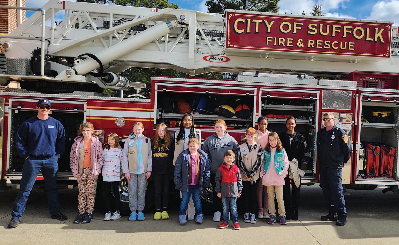 Girl Scouts from Troop 946 enjoyed a tour of Suffolk Fire Department Headquarters (Fire Station #6) to complete steps towards earning First Aid badges. Firefighters showed the troop their way around a fire engine, a ladder truck, how to don firefighting turnout gear, as well as where they eat, sleep, and work out between calls. They also learned about first aid on calls and toured the station’s museum.
