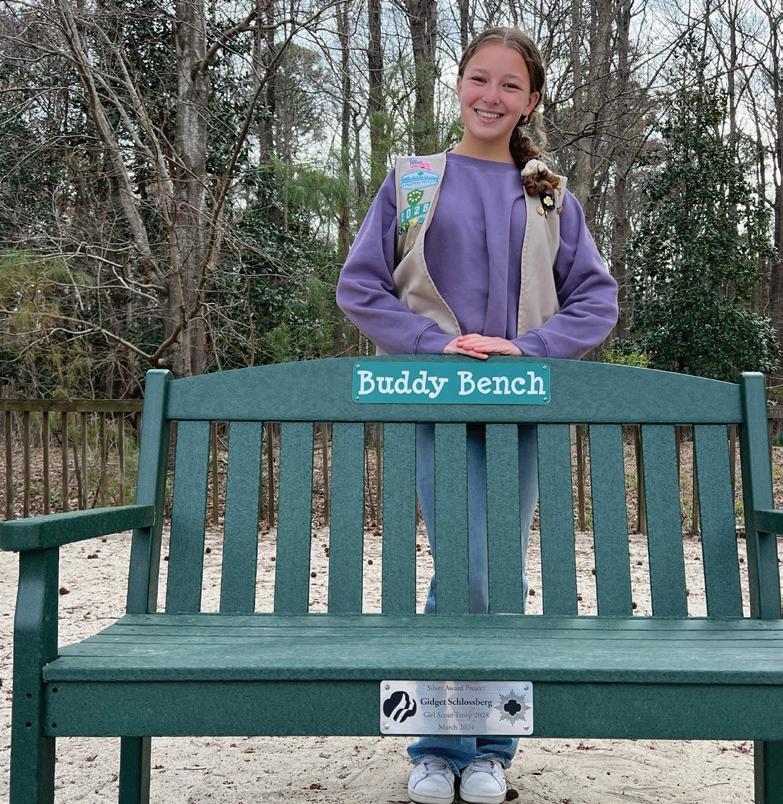 Among the many things Girl Scouting promotes, respecting oneself and others are key to Girl Scout Cadette Gidget Schlossberg. For her Girl Scout Silver Award, she created a buddy bench for the Beach Manor Preschool, securing the bench from NexTrex Program, a company that recycles plastic. Gidget led the school in collecting 1,000 pounds of plastic film items in a year’s period! She also donated a children’s book to explain the use of a buddy bench to the school for teacher use. “A Buddy Bench is a non-verbal way for children to express needing a friend,” Gidget said when describing her project. “By sitting on the bench, it shows other kids that they need a friend to play with. Having something like this around for kids to use is really important. Hopefully, when other kids see someone sitting on the bench they will walk over and ask them to play.”