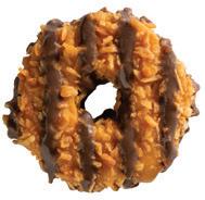 Crispy cookies topped with caramel, toasted coconut, and chocolaty stripes