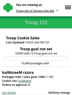 En la página Mi Tropa, puedes ver qué Girl Scouts han establecido su objetivo y publicado su sitio. Luego, sigue el progreso para ver qué Girl Scouts tienen pedidos que aprobar y qué cookies necesitarán.