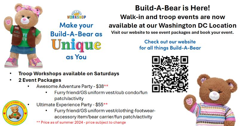 Build-A-Bear Workshops are available for walk-in and troop party events at our DC location. Information can be found on our website at https://www.gscnc.org/en/shop/build-a-bear-workshop.html