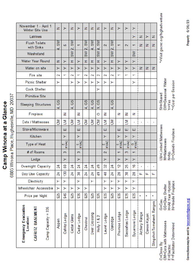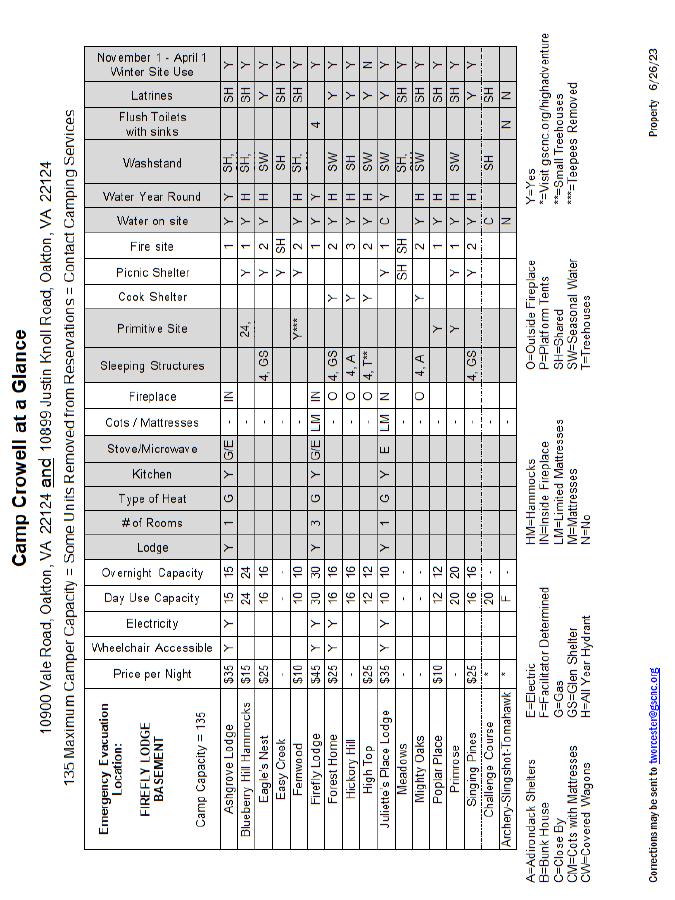 Our campsites have many wonderful amenities for Girl Scouts to enjoy thanks to generous donors. The Appendix at the end of Volunteer Essentials contains eight detailed charts about our camp properties. Contact the Customer Care department at 202-237-1670 if you have any questions.