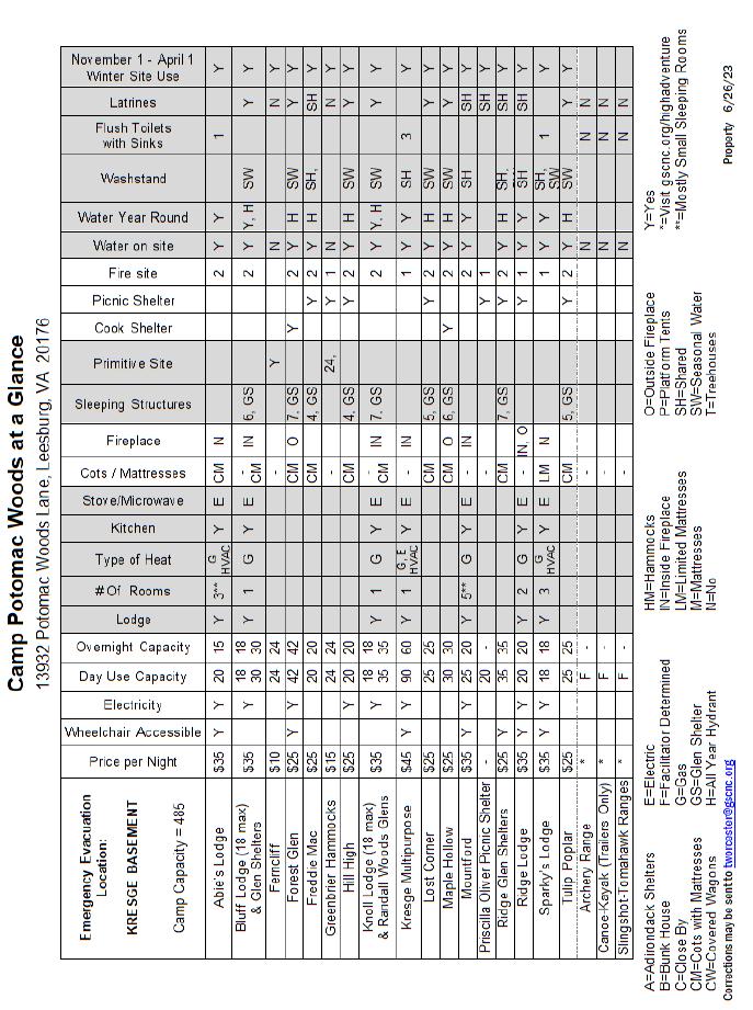 *Super Lodges include Kresge Dining Hall at Potomac Woods, Cafritz Lodge at Winona, Firefly Lodge at Crowell, Dudley Dining Hall at White Rock, Ross Lodge at Coles Trip, and Brighton Lodge at Brighton Woods.