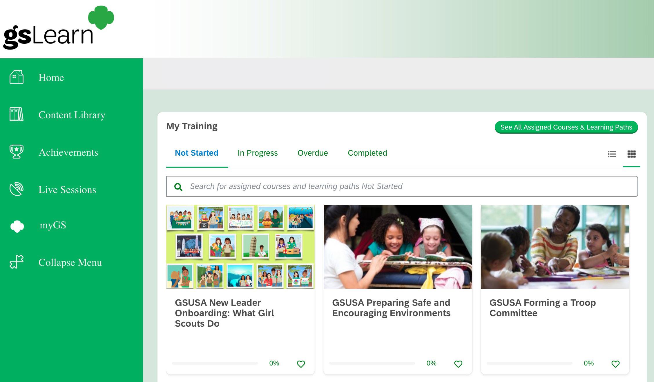 Unleash the confident troop leader within through our online training forum, gsLearn! Training for new leaders, service team members, facilitators and more is available for all active volunteers. Dive in and access courses on the go, track your progress and more by signing into your myGS account at mygs.girlscouts.org and clicking the gsLearn logo.*