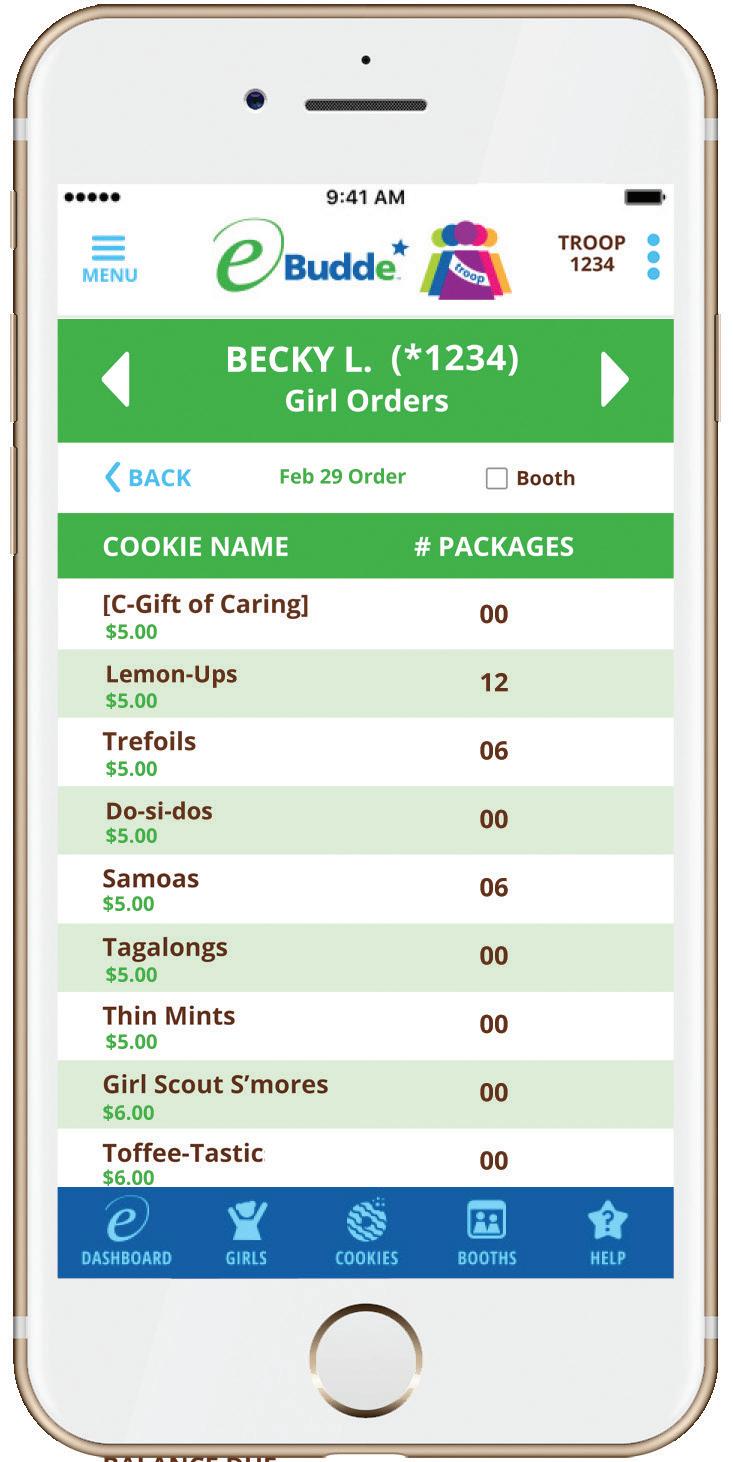 • Distributes order cards, calculates totals, enters inventory in eBudde, and submits the troop's initial cookie and Girl Scout reward orders