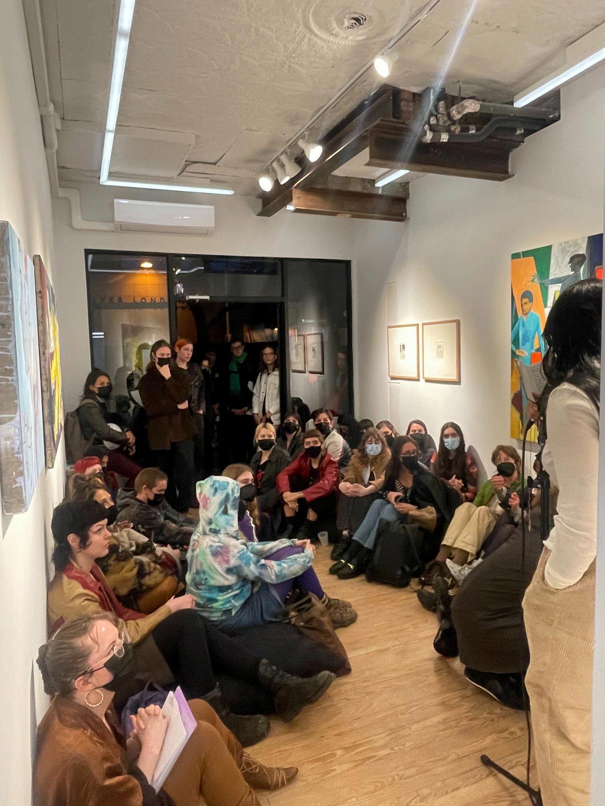 AP: I’d like to think the effects of Calliope have started to occur, but I’m sure part of this sense is self-flattery. The other part is the overwhelming public feedback on the streets I’ve received after we host an event, as well as the turnouts. We have hosted six: Bon Service and Honey’s Brooklyn (2022), and Espace Loulou, No Gallery, M. LeBlanc, and Pangée (2023). For the two Montréal iterations I was present for, I’d stayed in Mile End with close friends. The days following the events, I was met with gushes about new senses of inspiration from people I ran into who’d gone, or seen, or heard, so that felt like a good sign, as if we have been revealing salamanders in the ecosystem’s depths. I do not think Marie and I have been alone in our thirst for elevated and femme poetry cultures, as I have seen a rash of new DIY events sporulating from around 2022 onwards that are more liberated in how frequently they may or may not occur. This was our ultimate hope with creating the series, so whether we helped to see an already-incoming revival of an exciting DIY poetry culture or not, I’d like to think we did. Calliope is a little different because it is fifty/fifty poets/performance artists, but each of these event series has something uniquely its own. Calliope’s uniqueness is the performance art in combination with the circus energy, the gallery spaces, the wines. It’s an immersive and highly curated experience of food, atmosphere, and fancy dressing; we travel like an old theatre troupe and curate the bill to create a sense of said troupe, meaning we have performers we bring with us from Montréal to New York, come back home again. Speaking from experiences running academic-oriented event series and performing my own work, repeating performers is radical/taboo in literary event hosting, and with good reason. But also, from my experience in the DIY culture from which Metatron sprang, repeat performers allow for a strong sense of community and familiarity. A scene emerges, and there’s a huge precedent for this in contemporary poetry. (Continued)