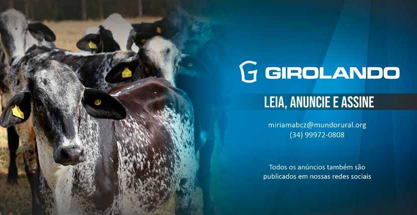 Revista Girolando: Órgão Oficial da Associação Brasileira dos Criadores de Girolando • Editora: Larissa Vieira lamoc1@gmail.com • Depto. Comercial: Mundo Rural (34) 3336-8888 - Míriam Borges (34) 9 9972-0808 miriamabcz@mundorural.org • Design gráfico: Yuri Silveira (34) 9 9102-7029 yurisilveira04@hotmail.com • Revisão: Maria Rita Trindade Hoyler • Fotografias: Jadir Bison (34) 99960.4810 jadirbison@yahoo. com.br • Conselho editorial: Domício Arruda Silva, Leandro Paiva, Edivaldo Ferreira Júnior, Miriam Borges e Larissa Vieira • Impressão CTP: Idealiza Grafica (43) 3373-7877 • Tiragem: 6.000 exemplares • Periodicidade: Trimestral (Março, Maio, Agosto e Novembro) • Circulação: Dia 15 dos meses ímpares • Distribuição: Para todo o Brasil via correios e Disponível na versão on line no site www.girolando.com.br. • Redação: Rua Orlando Vieira do Nascimento, 74 - CEP: 38040-280 - Uberaba/MG • Telefone: (34) 3331-6000 • Assinaturas: R$ 98,00/ano – financeiro@mundorural.org • 22 anos de circulação ininterrupta