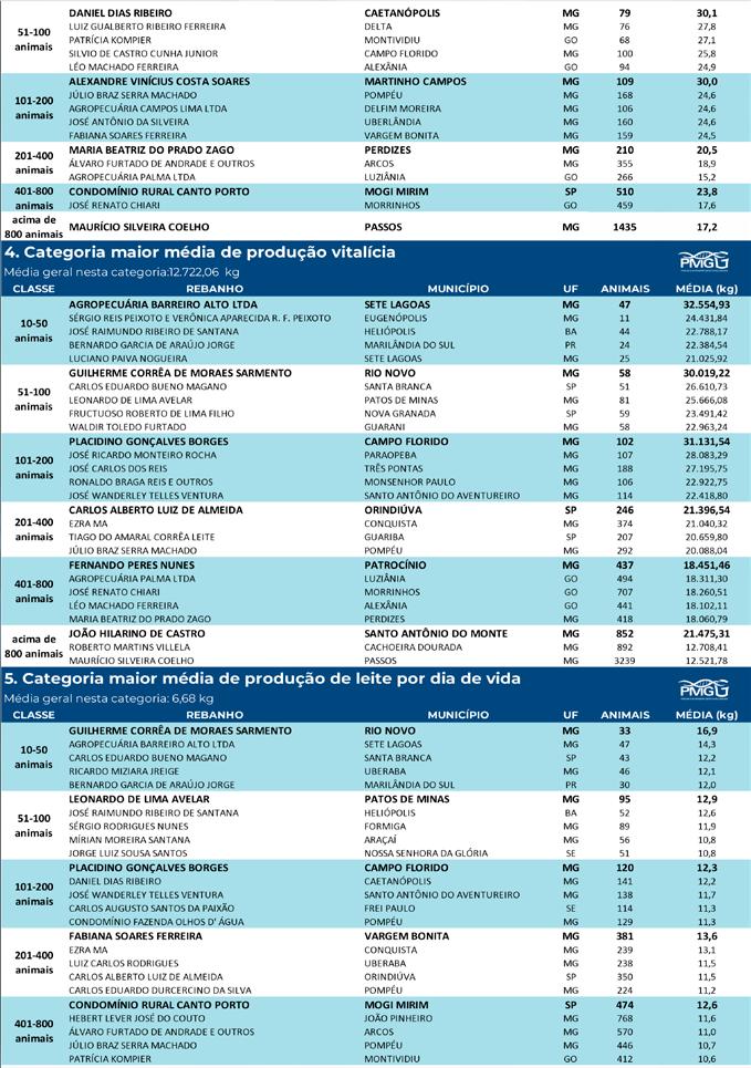 Os dados do Levantamento Top 100 2025, da Milkpoint, indicam que 1.191.497.813 litros foram comercializados pelos 100 maiores produtores de leite do País. Os números de produção média diária ficaram em 32.555 litros – esse foi o maior crescimento anual dos últimos 20 anos, refletindo a maior abrangência do levantamento e o avanço da produção dos participantes. Os dados revelam um crescimento expressivo superior a 13% entre 2023 e 2024, impulsionado tanto pela ampliação do levantamento, que contou com a participação de 16 novos produtores, quanto pela evolução da produção do grupo. Um dado especialmente relevante é que, ao analisar apenas os produtores que participaram do estudo, tanto em 2024 quanto em 2025, o crescimento foi superior a 11%, representando um incremento de mais de 100 milhões de litros de leite. Esse avanço é reflexo de diversos fatores, como: investimento em tecnologias, genética, gestão e bem-estar, que contribuem para a eficiência e competitividade do setor. Na raça Girolando, a maior fazenda produtora de leite é a Santa Luzia, em Passos/MG.
