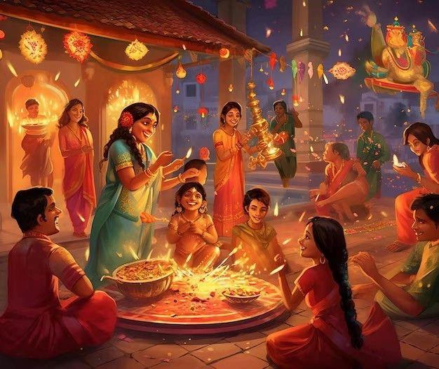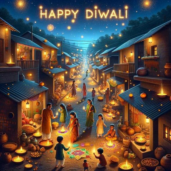 sintiendo una chispa de alegría en su corazón, su tristeza no había desaparecido pero comprendió que la luz del Diwali no solo está en la danzante llama de las diyas, sino también en su aldea, en las personas, en la esperanza compartida y en el coraje y la fuerza para continuar adelante a pesar de la adversidad y de la oscuridad.