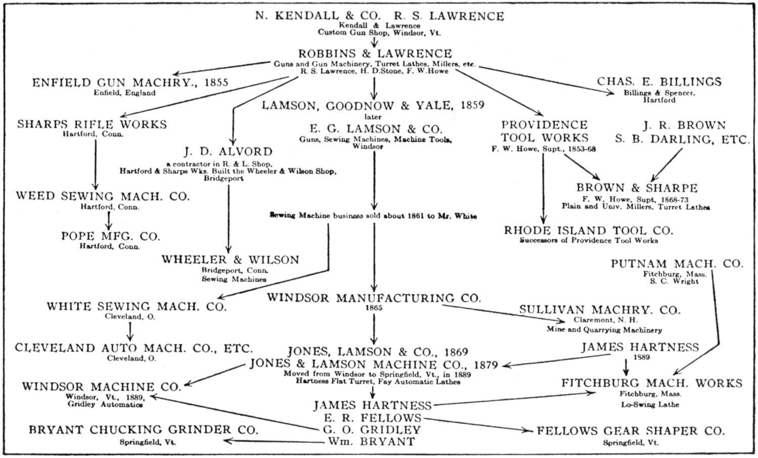 The Pratt & Whitney works, like the Colt Armory, has been a training school for successful tool builders. Worcester R. Warner and Ambrose Swasey were both foremen at Pratt & Whitney’s and left there to go west, first to Chicago and then to Cleveland. Some account of these two men will be given in a later chapter. Pratt & Whitney have had a marked influence on tool building in Cleveland, for, in addition to Warner and Swasey, E. C. Henn and Hakewessel of the National Acme Manufacturing Company who developed the multi-spindle automatic lathe, A. F. Foote of Foote, Burt & Company, and George C. Bardons of Bardons & Oliver, come from their shop. Johnston of Potter & Johnston, Pawtucket, was chief draftsman at Pratt & Whitney’s; and J. N. Lapointe who later developed the broaching machine, Dudley Seymour of Chicago, Gleason of the Gleason Works in Rochester, E. P. Bullard of Bridgeport, and F. N. Gardner of Beloit, Wis., inventor of the Gardner grinder, were all workmen there.