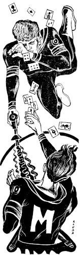 With a single sweep, he hurled the deck of cards at Lefler's head and surged upward. Lefler lost his balance and fell sidewise as he dodged the improvised missile. But even as he lost his equilibrium, he