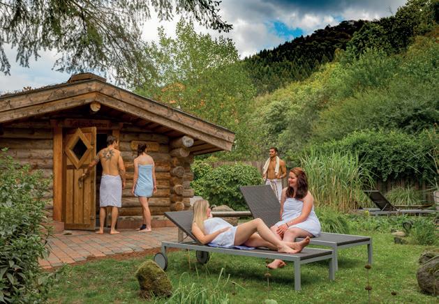 ... sauna område på 2 etager med 6 saunaer, pool, isfontæne, japansk afslapningsrum og saunahave med kelo bjælkehytte sauna