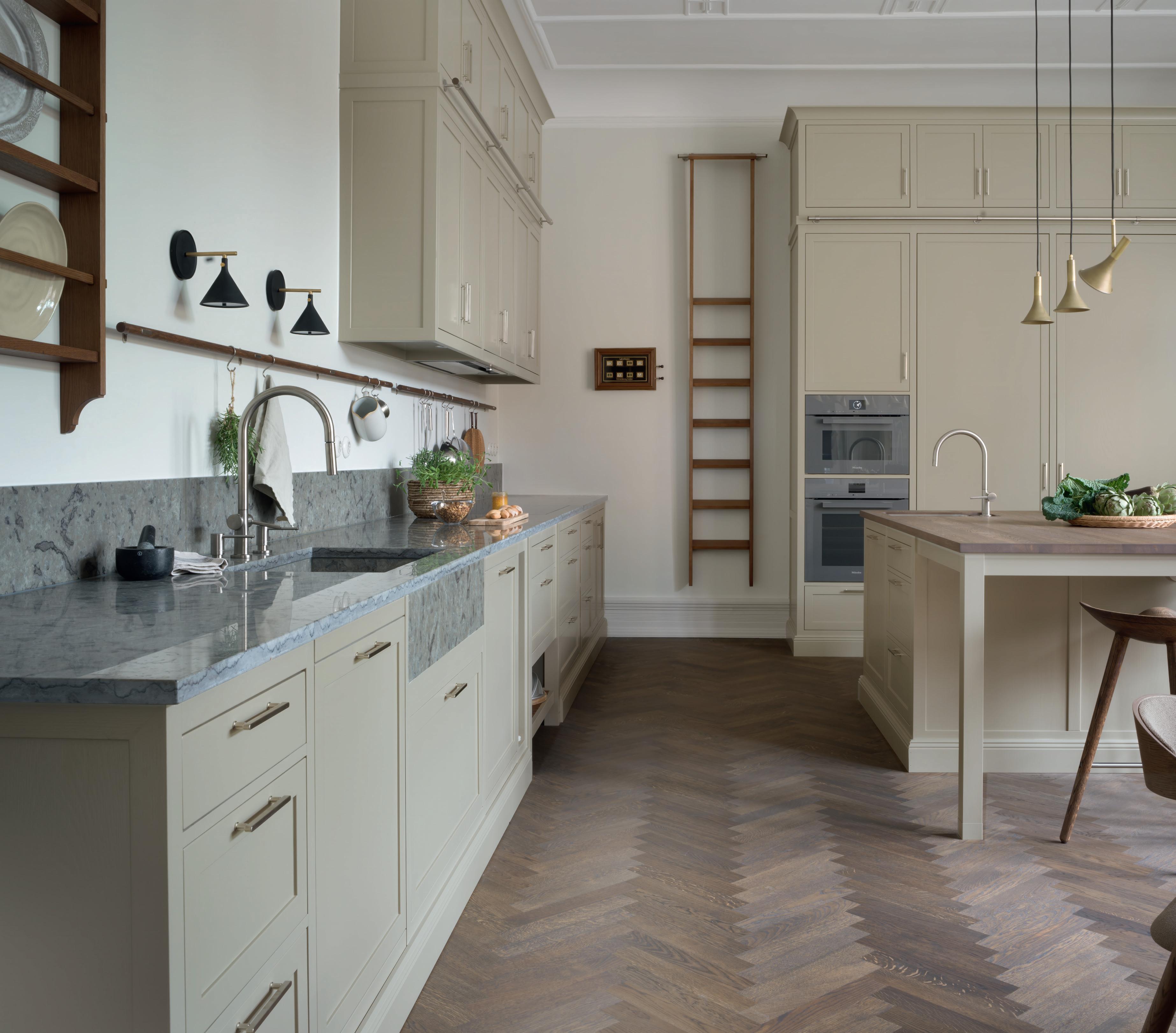 Må vi præsentere en moderne klassiker – her et køkken i Steneby modellen, håndmalet i farven Mandel. Modern Classic er en skøn blanding af nyt og gammelt. Håndmalede snedkerdetaljer med indenforliggende låge, brede skuffer og åbne hylder i stedet for topskabe.