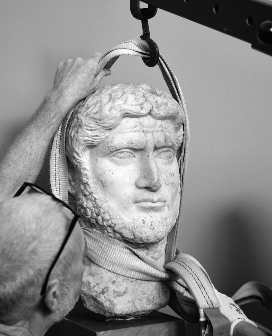 Scenograf Mai Katsume og videokunstner Magnus Pind har skabt et univers af lyd, video og scenografi, der vækker Glyptotekets oldtidssamling til live og giver anledning til at reflektere over kunstens rolle i både fortidens og nutidens magtkampe.