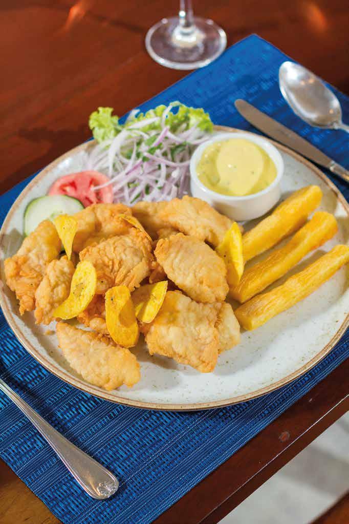 Pesca de temporada frito al estilo jalea, con yucas fritas y zarza criolla. Servido con salsa tártara.