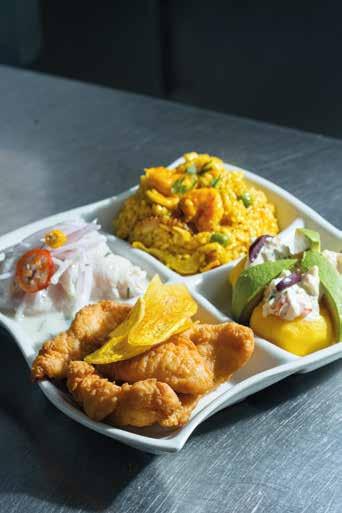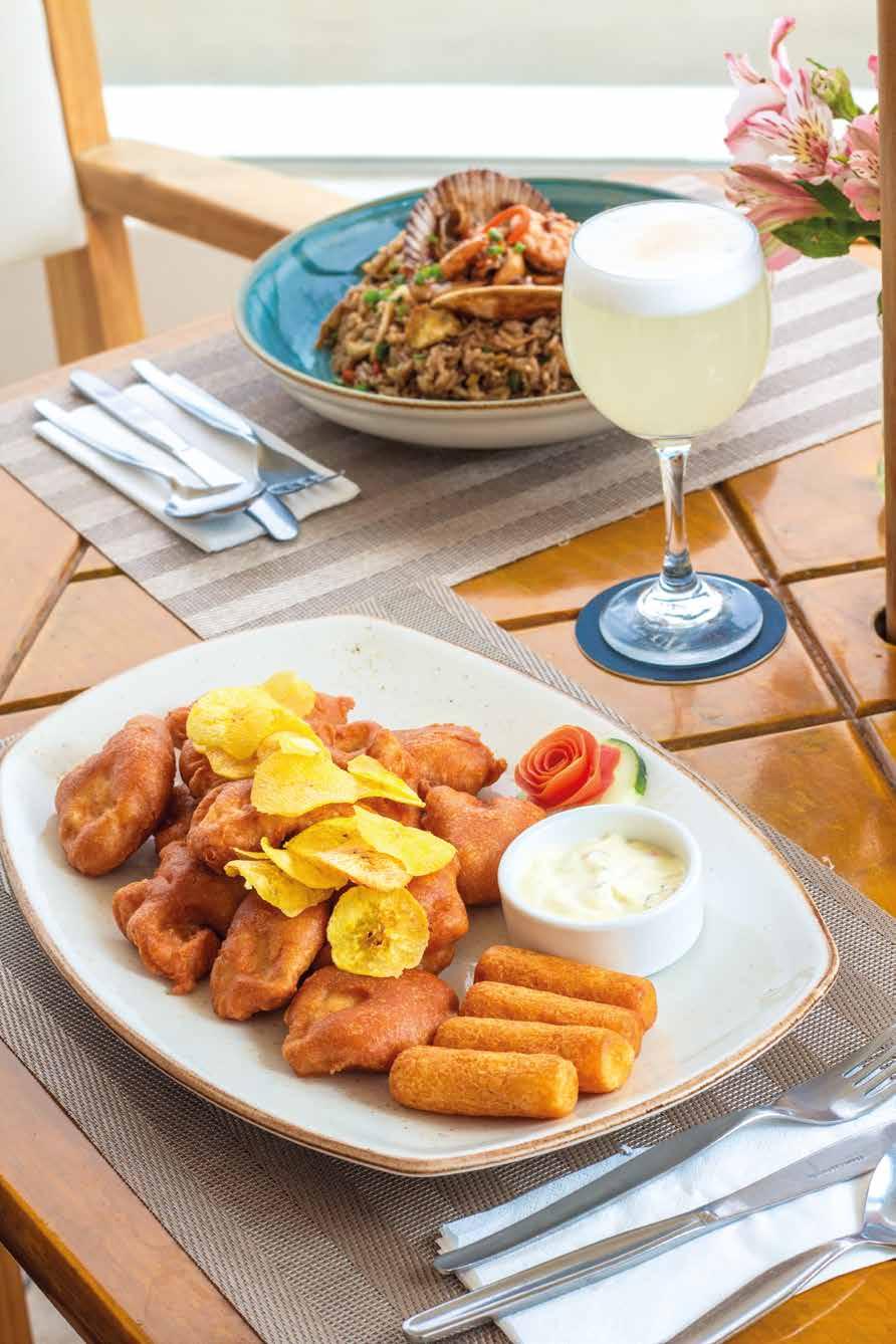 Servido en fuentes: Cebiche de pesca de temporada, chicharrón criollo de pesca de temporada y arroz con mariscos. Acompañado de yucas prensadas fritas.