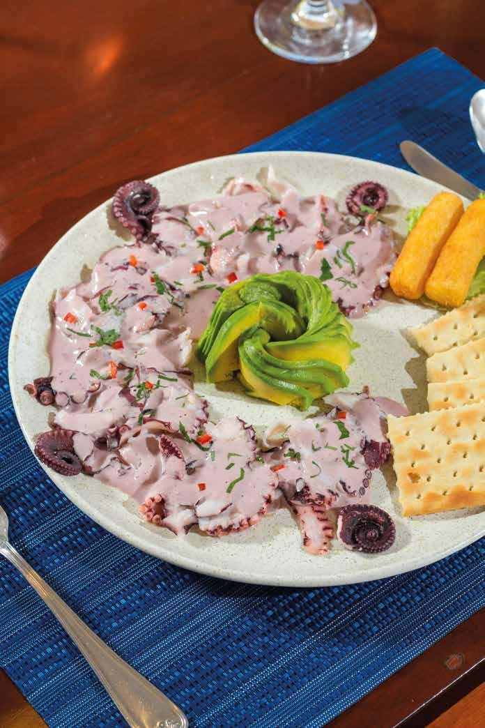 Octopus with black olive cream, avocado and fried maniocs. 58