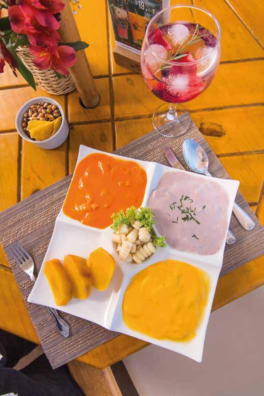Slices of fish marinated with lime and yellow pepper cream, piquillo pepper cream and olive cream. Served with sweet potato and corn.