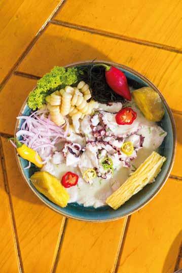 Láminas de pesca de temporada al limón, rocoto, ají mochero y leche de tigre de ají limo, acompañado de yuca, camote, cancha y choclo. Slices of catch of the day fish marinated with lime and peruvian red peppers. Served with manioc, sweet potato, toasted corn and corn 62