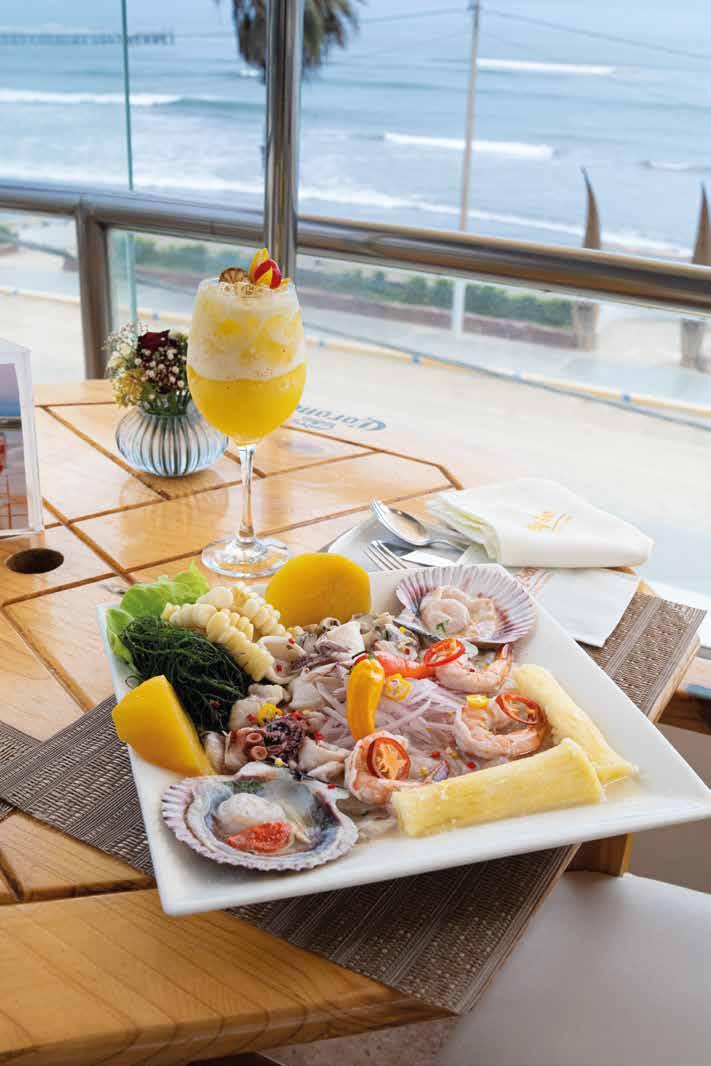 Ronda de cebiche de pesca de temporada, tiradito a la crema de ají amarillo y al pimiento piquillo, langostinos en salsa coctel, pulpo y calamar al olivo. Acompañado de choritos norteños a la chalaca, conchitas negras al limón y yucas prensadas fritas.