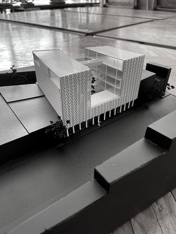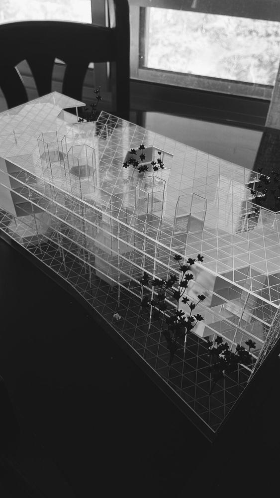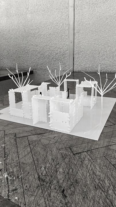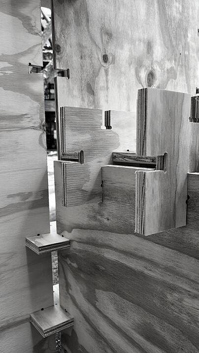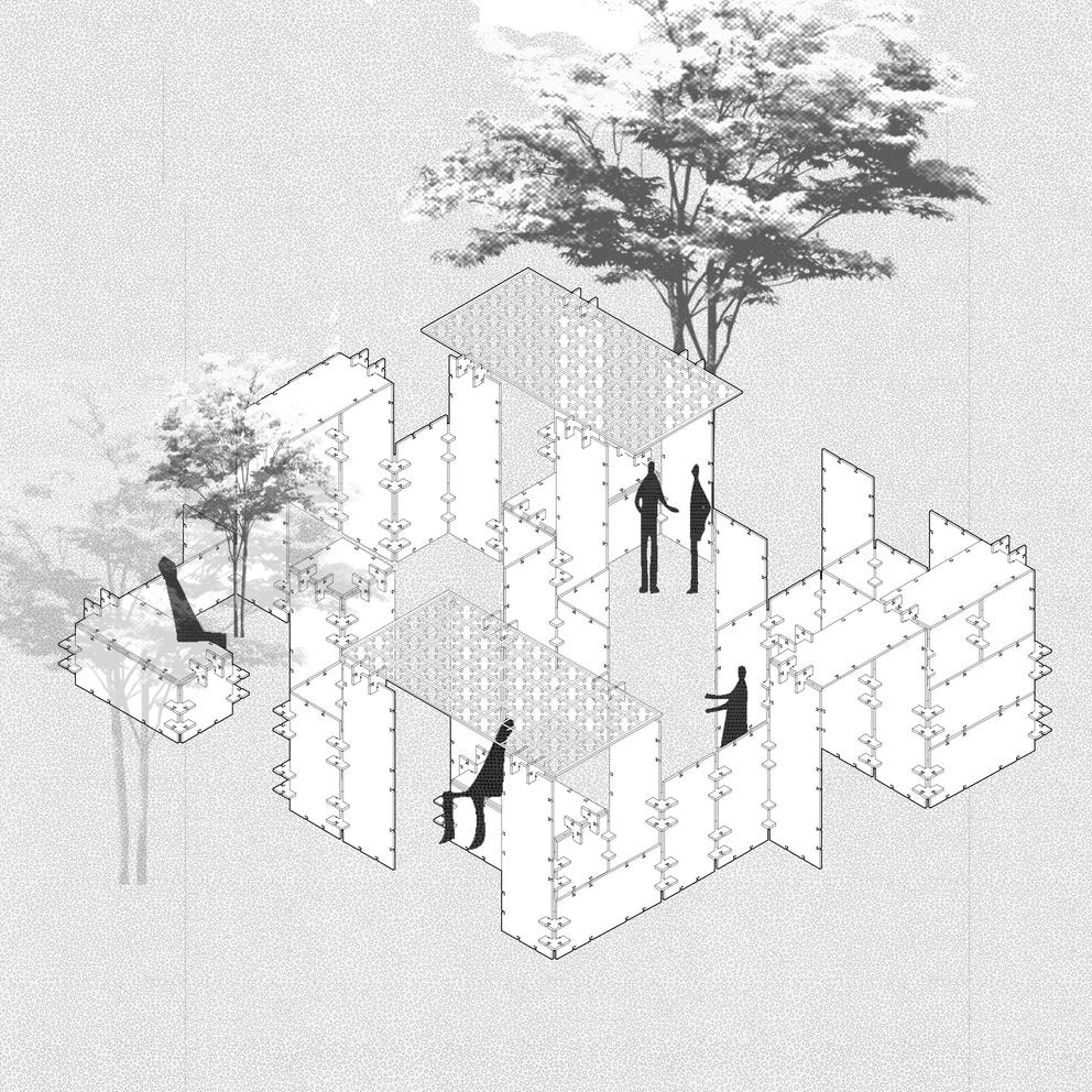 Se parte de la utilización de una grilla orientada por las preexistencias que ordene el espacio y permita la creacion de un sistema de placas unidas por encastres. Dando una forma de trabajo sencilla y rápida al igual de ofrecer una mayor cantidad de propuestas y configuraciones. Esta, genera planos interconectados y crea espacios que mediante su disposición cambiante de experiencias únicas para el usuario. La variada configuración de estos elementos generan diversidad de espacialidades formando recorridos y sensaciones cambiantes.