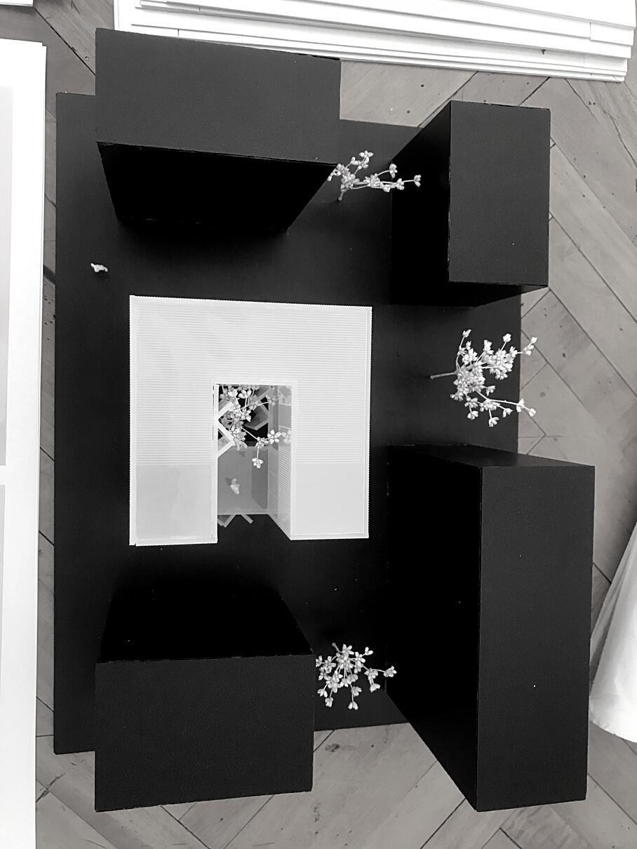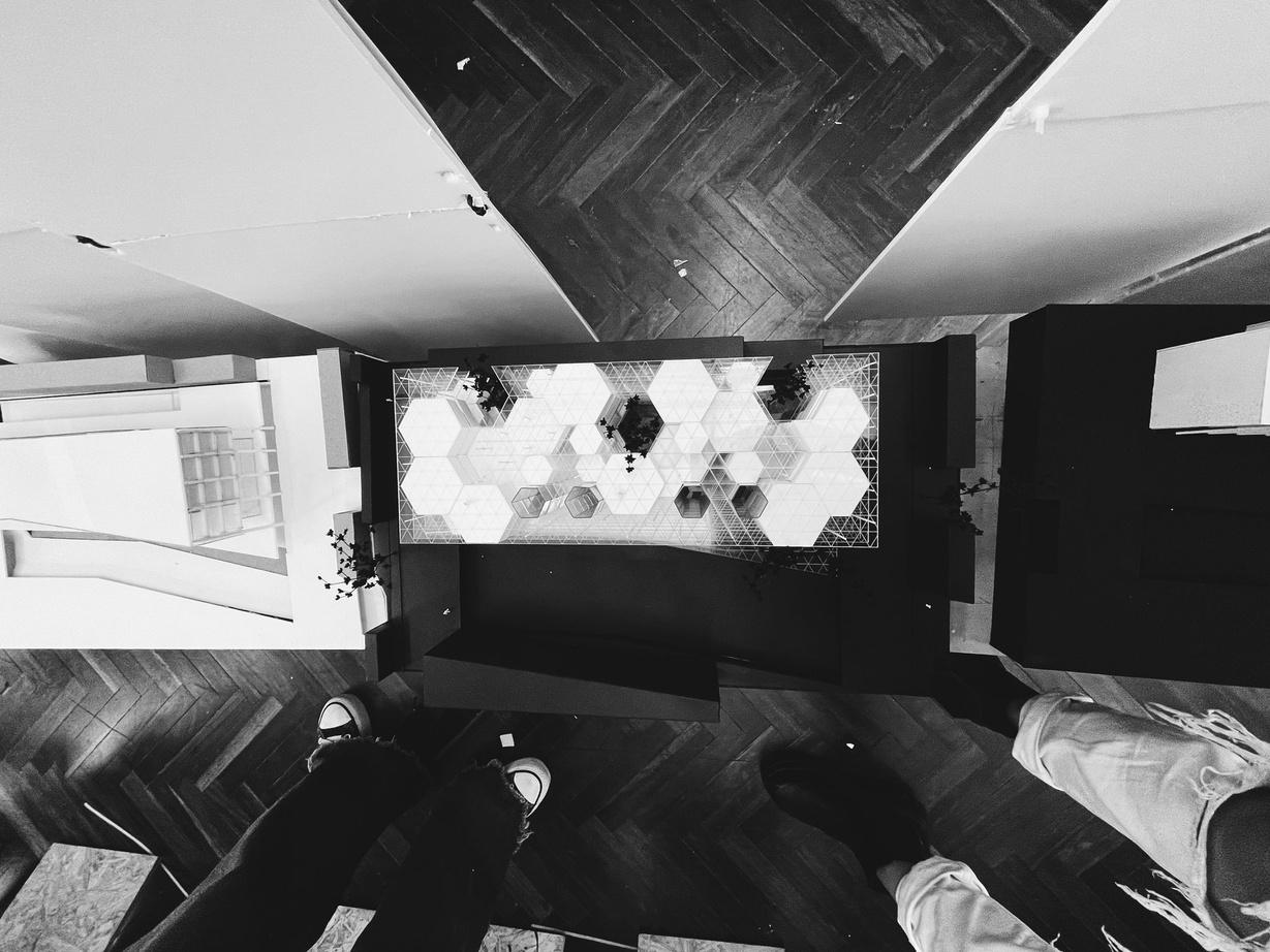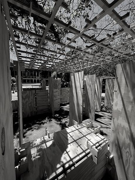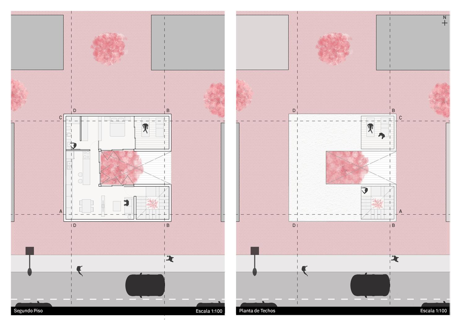 Se parte de la utilización de una grilla orientada por las preexistencias que ordene el espacio y permita la creacion de un sistema de placas unidas por encastres. Dando una forma de trabajo sencilla y rápida al igual de ofrecer una mayor cantidad de propuestas y configuraciones. Esta, genera planos interconectados y crea espacios que mediante su disposición cambiante de experiencias únicas para el usuario. La variada configuración de estos elementos generan diversidad de espacialidades formando recorridos y sensaciones cambiantes.