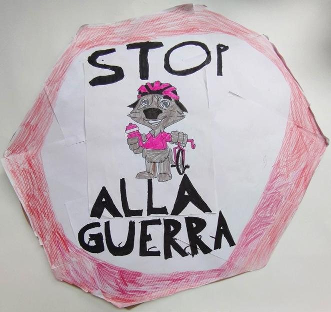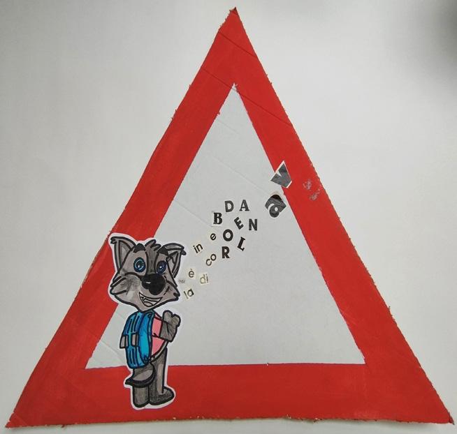 Biciscuola-Giro di Italia. Abbiamo ideato e realizzato dei cartelli stradali con la mascotte del Giro lupo Wolf. I nostri cartelli: senso unico, attenti al cemento, attenzione animali in strada, divieto di accesso, stop alla guerra, attenzione ponte rotto, attenzione padroni maleducati, attenzione attraversamento lupi scolari, albergo per lupi ciclisti.