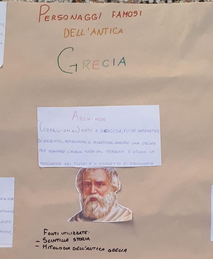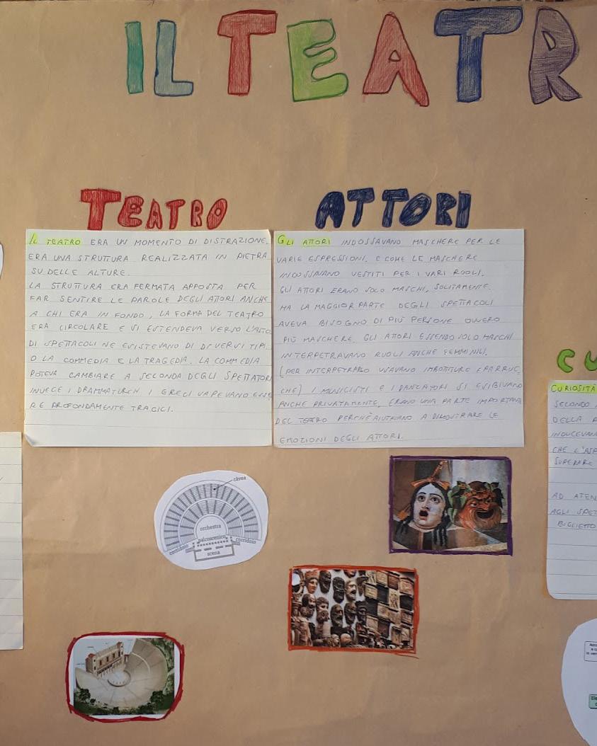 Valentino, Tito e Andrea hanno cercato notizie sui personaggi greci che si sono distinti nelle scienze e nella filosofia; Giulia, Diego, Mia e Francesco si sono dedicati agli sport e alle Olimpiadi; Lorenzo, Alina, Mattia e Leonardo hanno lavorato sul teatro e Clio, Agnese e Sebastiano hanno approfondito la religione gli dei. All’interno dei gruppi ognuno aveva un compito (selezionare gli argomenti, rielaborare le notizie trovate, cercare le figure, ecc.) e tutti hanno contribuito.