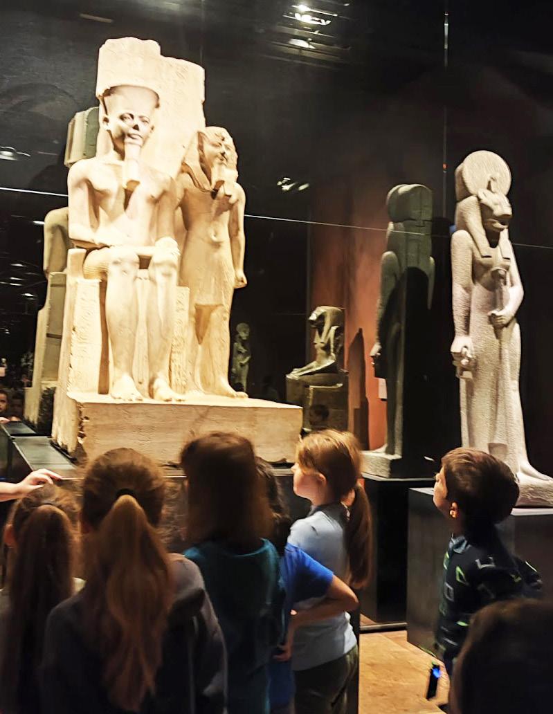 Giulio Romano per andare a Torino a visitare il museo egizio. Siamo saliti su un pullman che ci ha portati a destinazione dopo circa due ore di viaggio: all’interno del pullman l’autista ci ha preparati al clima torrido e arido egizio alzando la temperatura del climatizzatore a 100°, tant’è che qualcuno di noi vedeva il pavimento ricoperto di sabbia e, al posto delle auto, superavamoi cammelli in autostrada. Non vedevamo l’ora di arrivare a Torino.