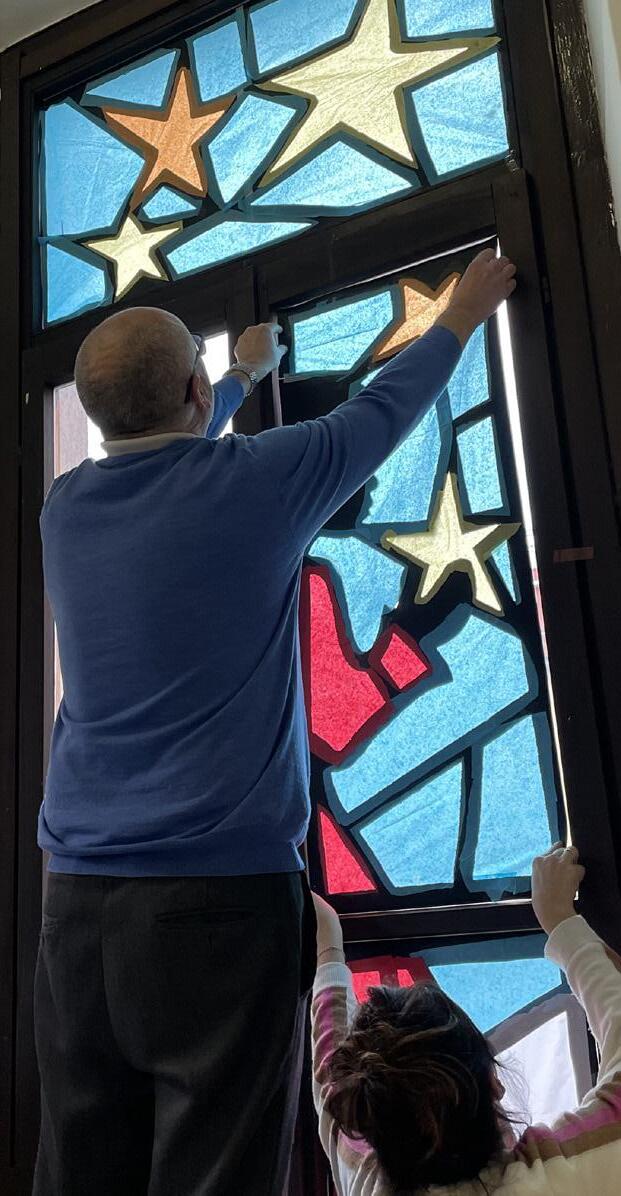 Natale è il momento dell’anno in cui il tempo subisce una sospensione. È vissuto come attesa in cui presente, passato e futuro si fondono. La sua atmosfera, le sensazioni, l’attesa (che anche gli adulti vivono rievocando il Natale sperimentato da piccoli), viene sentita in modo particolare dai bambini che la ritrovano come momento da condividere con la famiglia ma anche con compagni e insegnanti. Quest’anno la nostra scuola ha deciso di dare forma a quest’atmosfera illuminando la scuola con grandi vetrate colorate. Ne è venuta fuori una cosa spettacolare, dall’effetto magico, tanto da incuriosire i passanti che per un attimo sospendevano la corsa allo shopping e fotografavano la nostra scuola. Quasi fosse uno di quegli enormi alberi addobbati che si vedono in quel periodo in città. Un lavoro comune in cui, ogni classe del nostro plesso, ha realizzato un pezzettino che è andato a comporre il lavoro finale. Insomma, la somma di