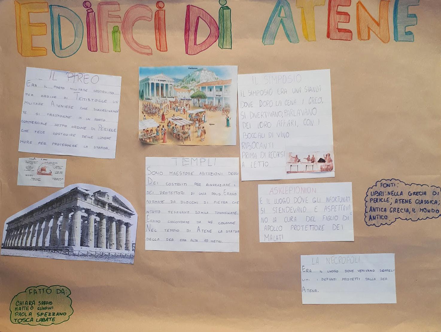 Tutto è iniziato quando abbiamo studiato i Greci e la maestra Maria Rosa ci ha proposto di approfondire gli argomenti più importanti con delle ricerche da svolgere in classe divisi in gruppi. Prima di iniziare la maestra ci ha spiegato passo passo come si sviluppa una ricerca e quali strumenti utilizzare per trovare tutte le informazioni necessarie. Siamo stati in biblioteca e abbiamo preso tutti i libri di storia e sui Greci. In seguito sono stati creati i gruppi e assegnati gli argomenti: Tosca, Paola, Matteo, Alessandro e Chiara si sono occupati dell’arte in genere e, soprattutto, degli edifici più importanti che si trovavano ad Atene; Olivia,
