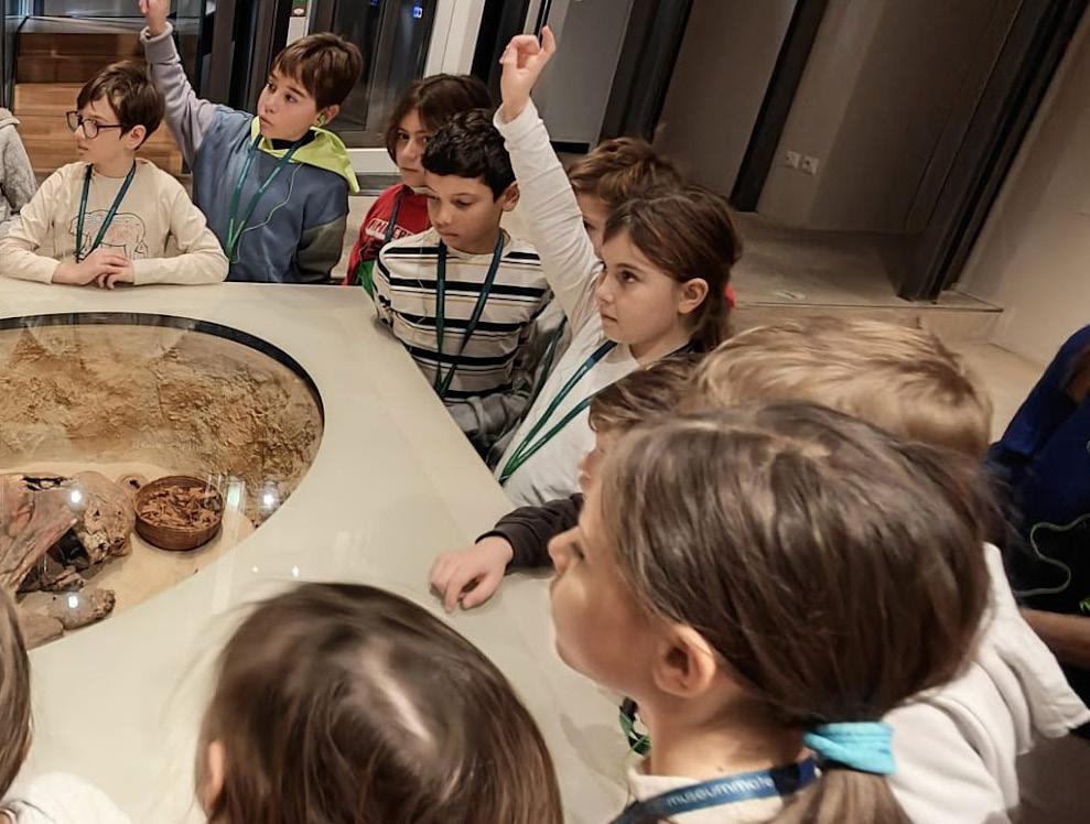 dato degli auricolari in modo da sentire meglio la loro voce durante il tour. La prima tappa del nostro percorso “egiziano” è stata vedere e capire le fasi della mummificazione e come questa si sia evoluta nel tempo. È stato emozionante vedere dal vivo il primo esemplare di mummia messa in posizione fetale sul fianco sinistro, all’interno di una buca scavata nella sabbia. Sembrava stesse dormendo. Il calore della sabbia ha permesso che si conservasse fino a noi. “Pensate com’è stato scomodo stare così per 2000 anni nella stessa posizione!”