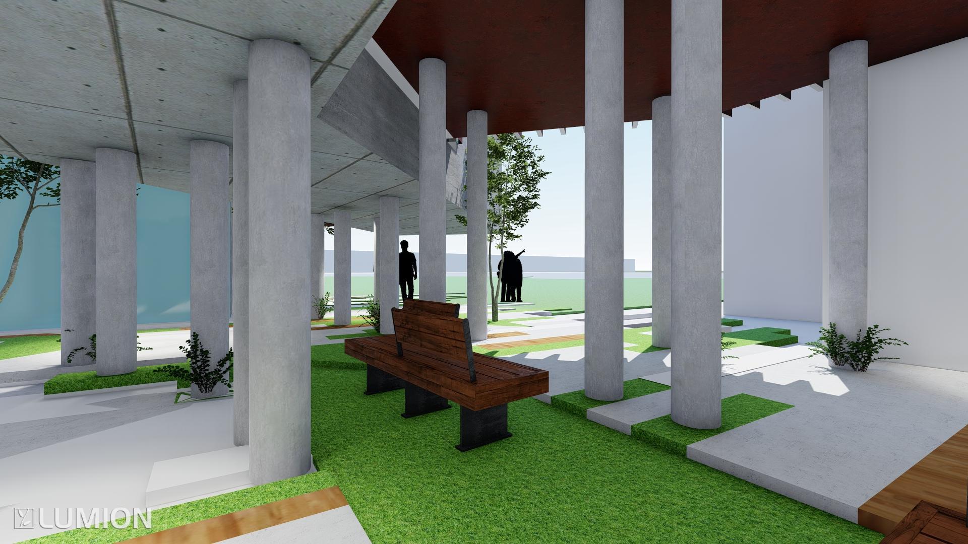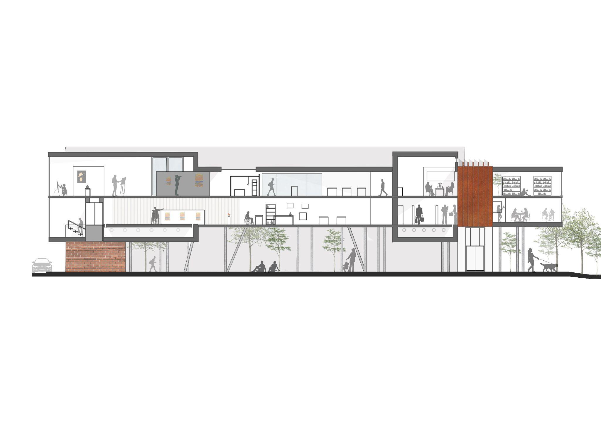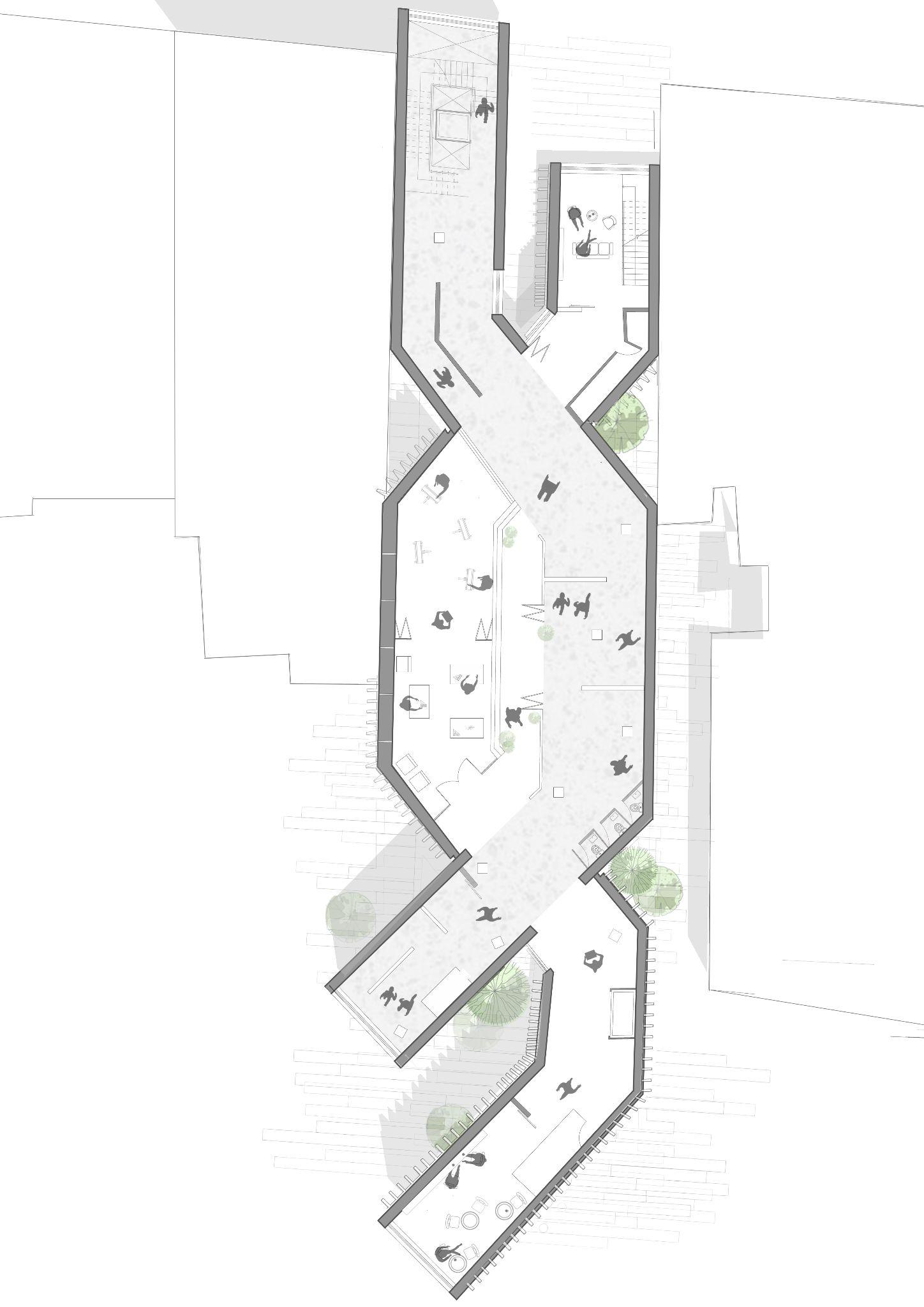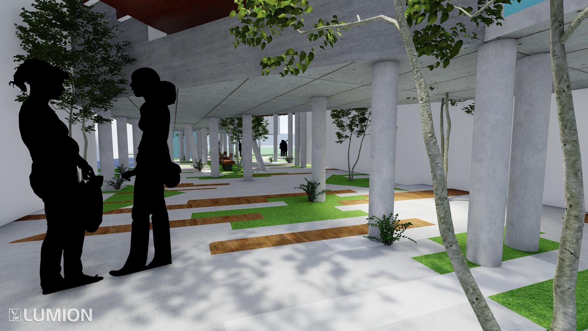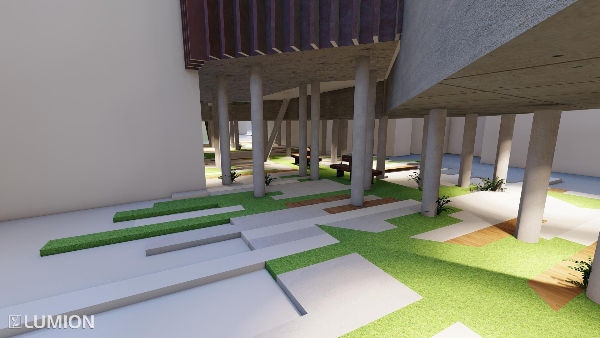 GROUND FLOORS HOLDS THE MAIN FLOW OF CIRCULATION AS THE BUILDING IS ELEVATED ON A FOREST OF CONCRETE LEGS.