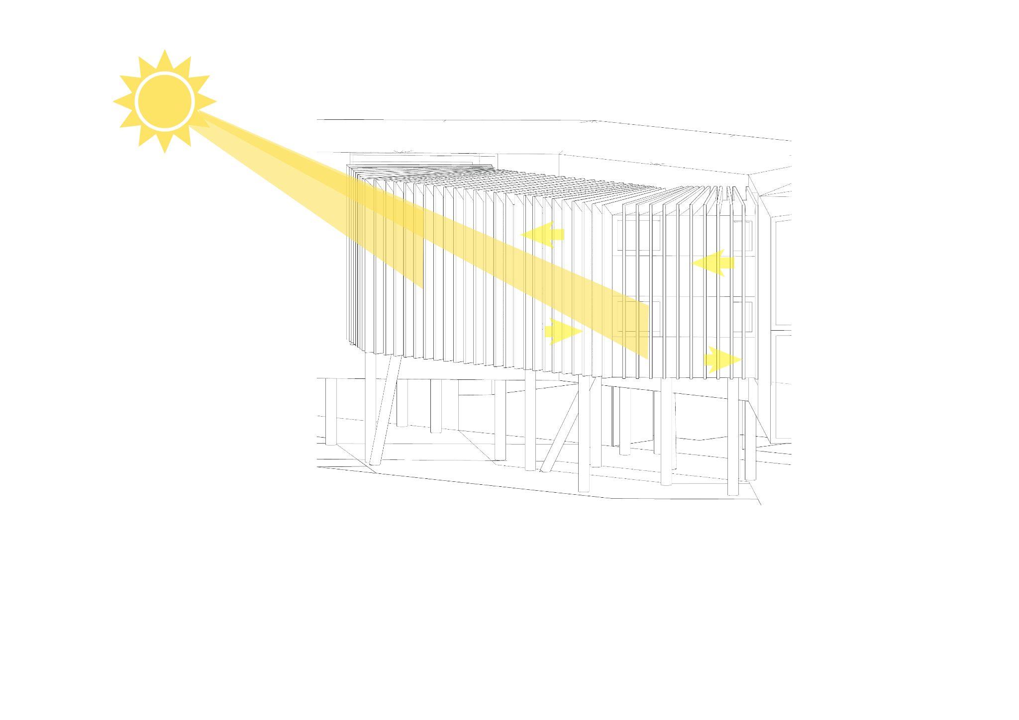 THE SLABS IN THE SKIN ARE CONTROLLED FROM THE INTERIOR TO REGULATE BOTH THE WIND AND SUN. THE MECHANICAL MOVES THEM EITHER LEFT OR SIGHT TO MAXIMISE OR MINIMISE THE ELEMENTS BY THE USER.