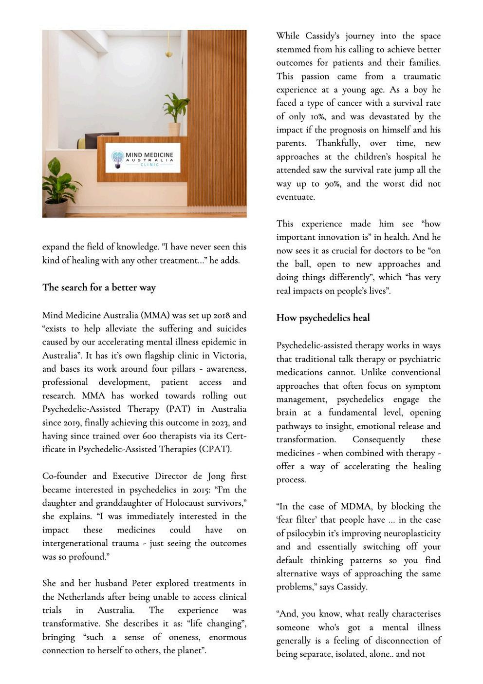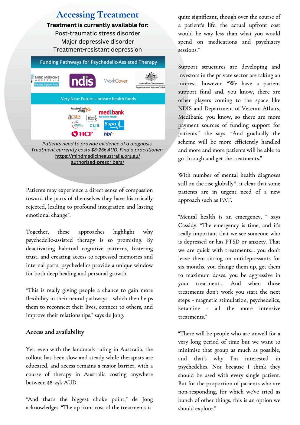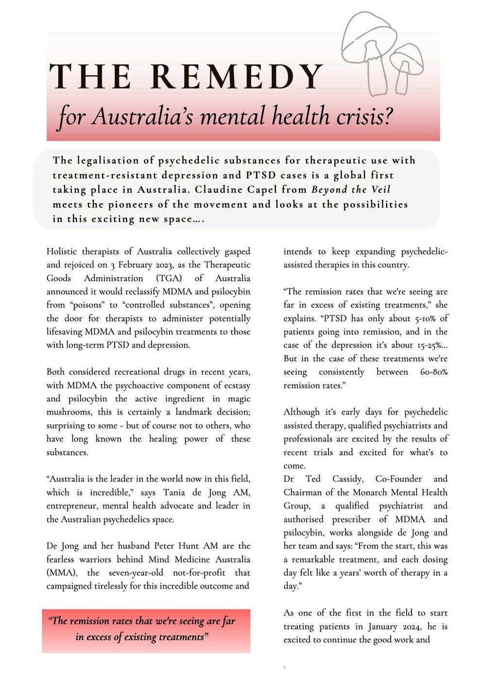 Australia is now the world leader in legally sanctioned psychedelic-assisted therapy International eyes are on the country to observe its model for safe, ethical, and effective delivery