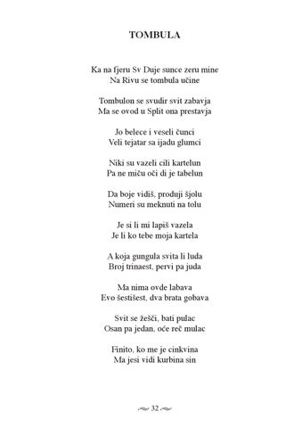TOMBULA Ka na fjeru Sv Duje sunce zeru mine Na Rivu se tombula učine Tombulon se svudir svit zabavja Ma se ovod u Split ona prestavja Jo belece i veseli čunci Veli tejatar sa ijadu glumci Niki su vazeli cili kartelun Pa ne miču oči di je tabelun Da boje vidiš, produji šjolu Numeri su meknuti na tolu Je si li mi lapiš vazela Je li ko tebe moja kartela A koja gungula svita li luda Broj trinaest, pervi pa juda Ma nima ovde labava Evo šestišest, dva brata gobava Svit se žešči, bati pulac Osan pa jedan, oće reč mulac Finito, ko me je cinkvina Ma jesi vidi kurbina sin